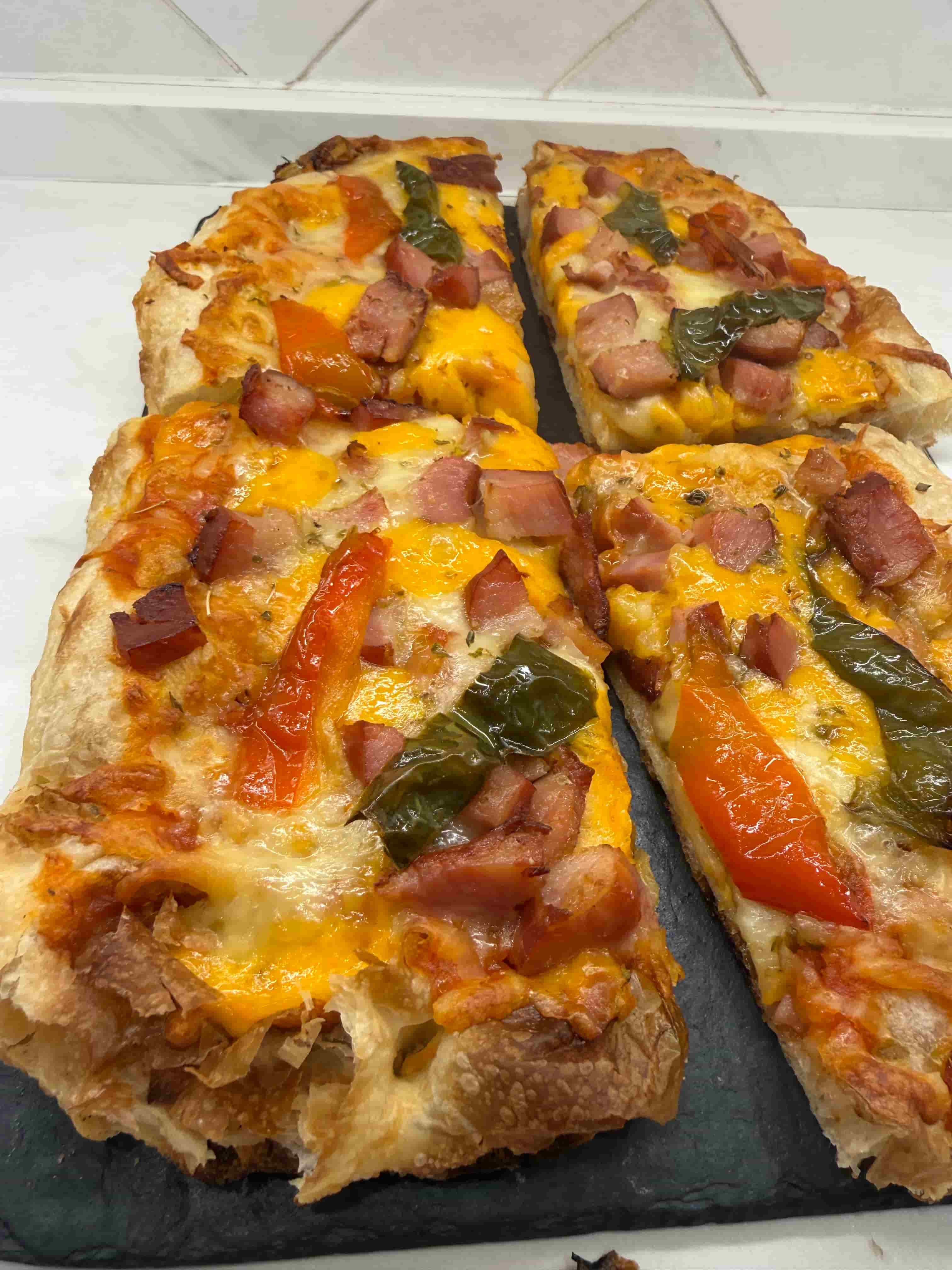Focaccia verduras, mozzarella, pisto, Bacon y queso Cheedar.