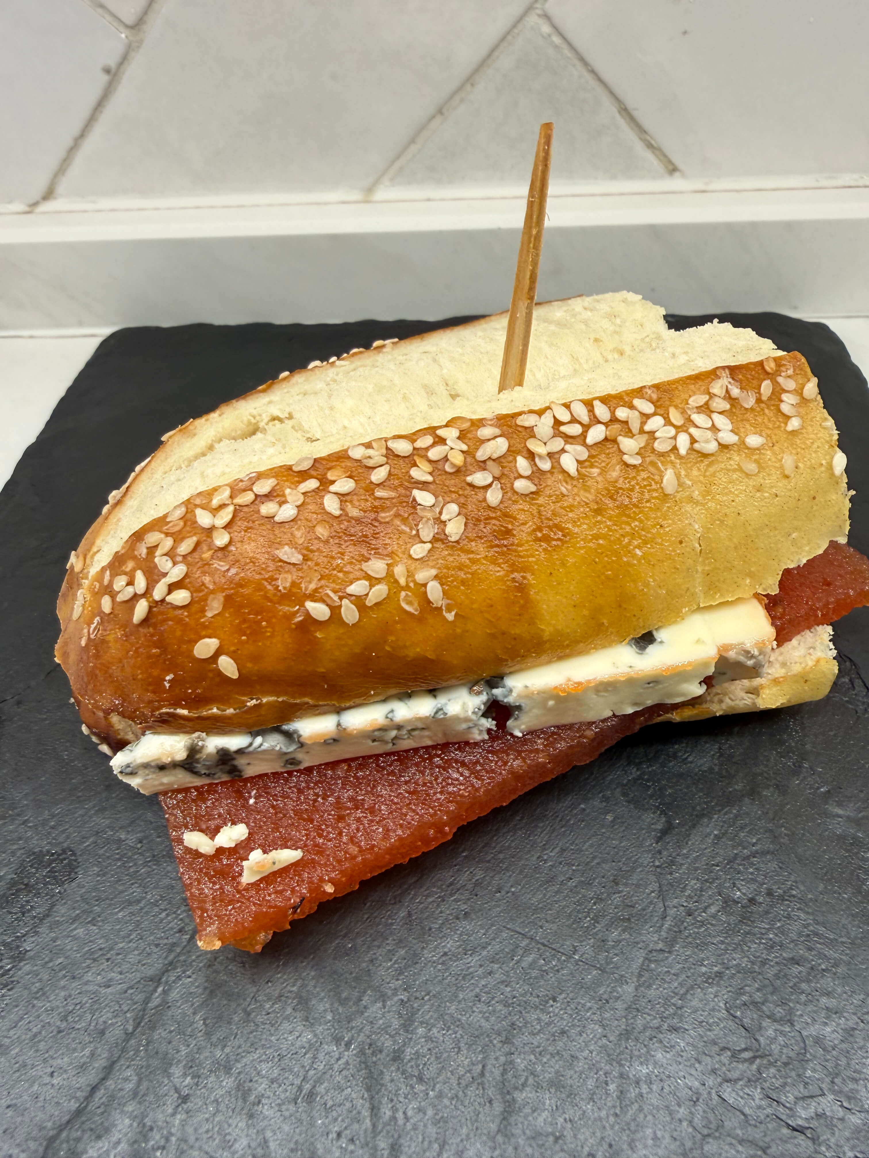 Pan Bretzel con queso azul y carne de membrillo.