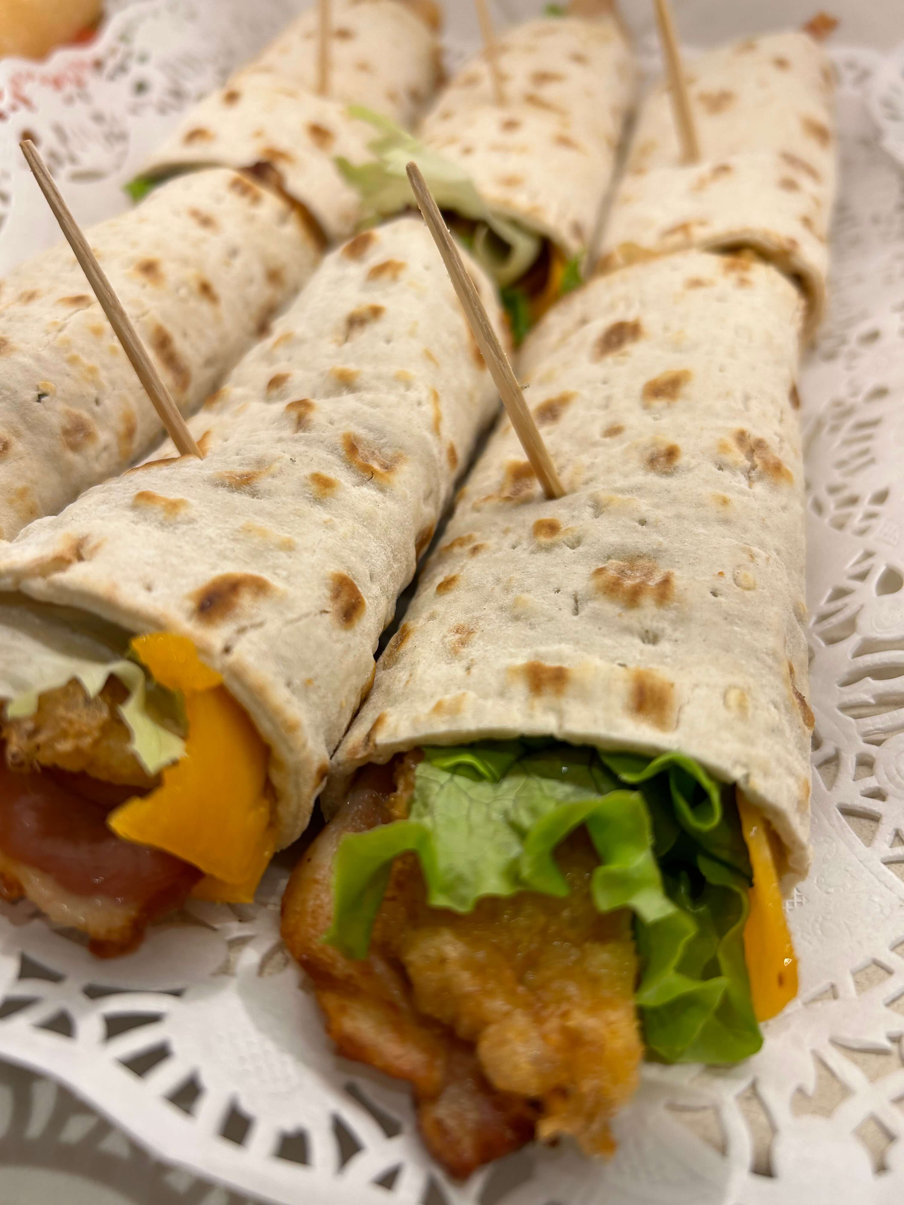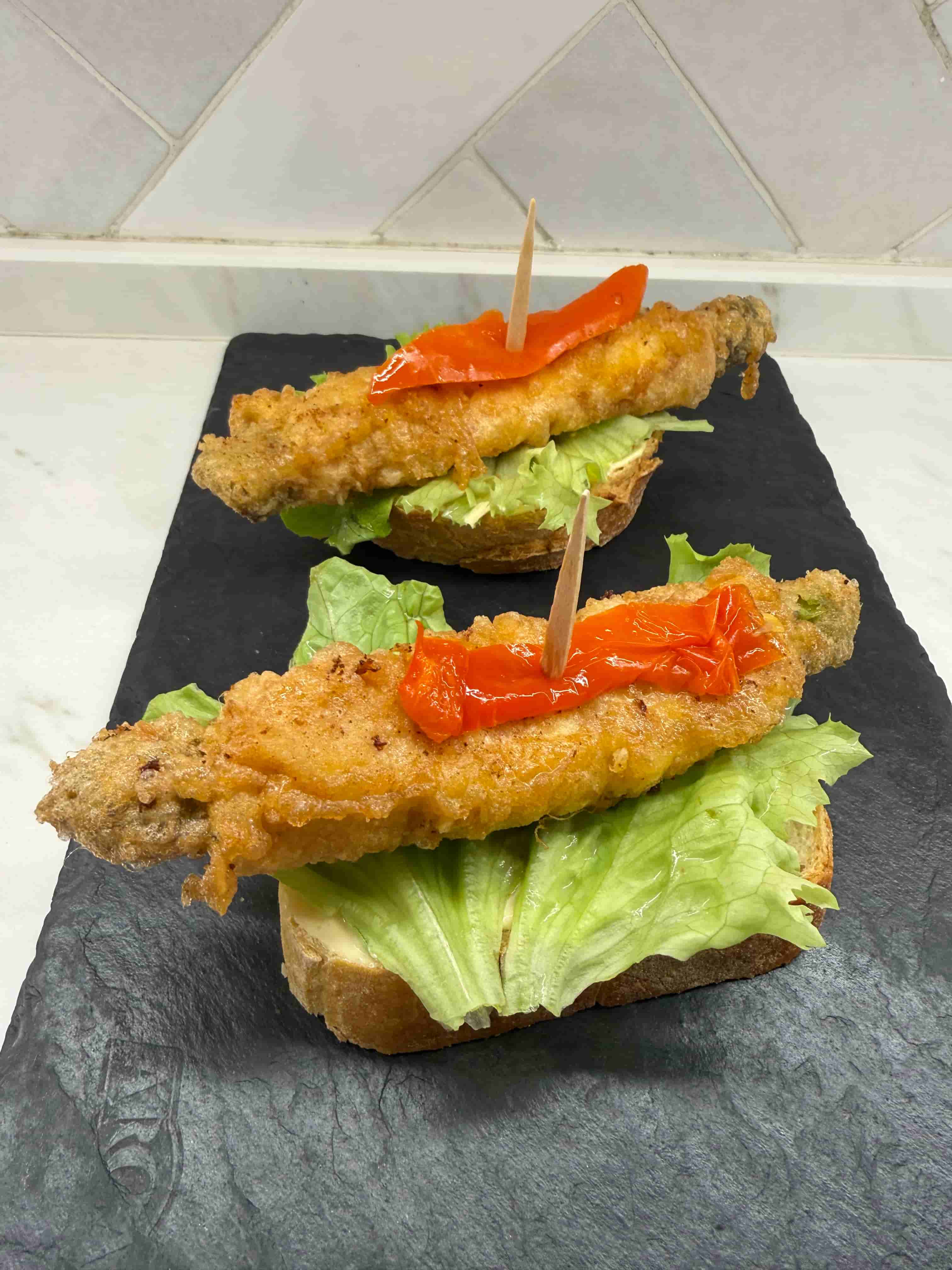 Montadito de pollo rebozado, lechuga, tomate y mayonesa.