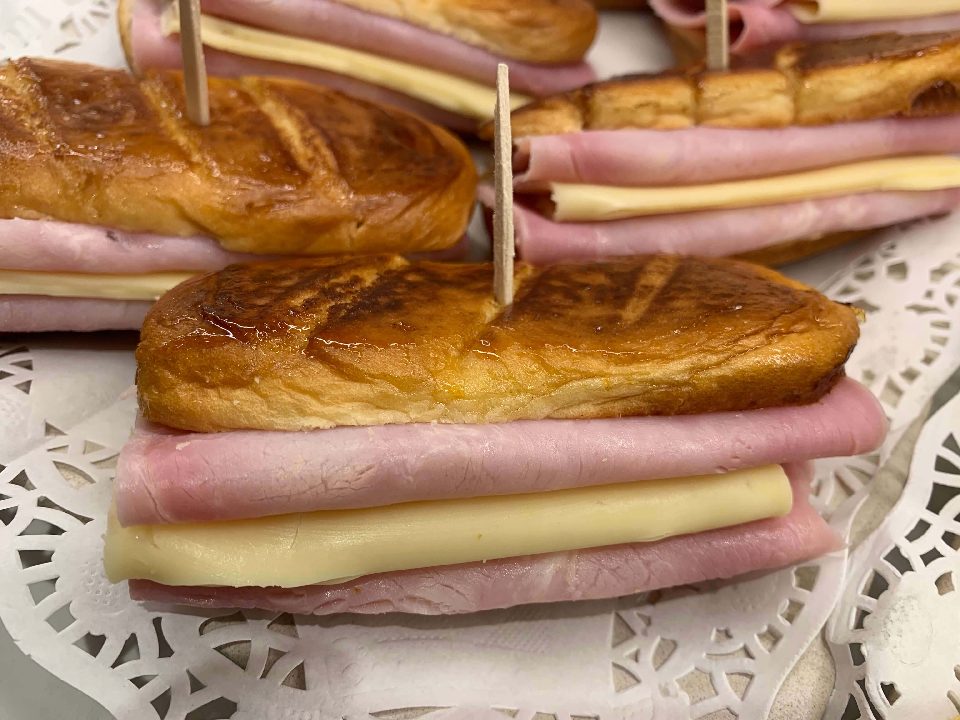 Medianoche caramelizada con jamón York y queso.
