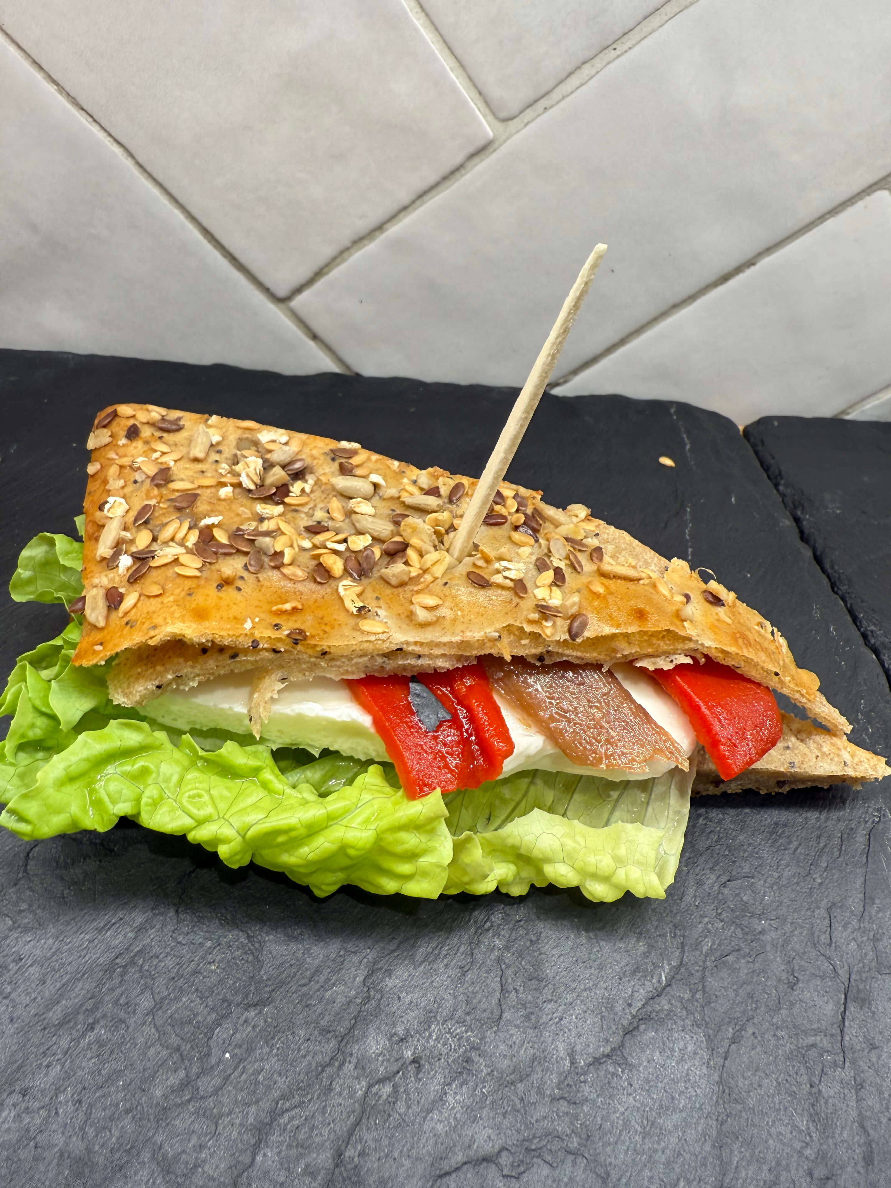 Hojaldre integral, lechuga, queso fresco, anchoa y pimiento.
