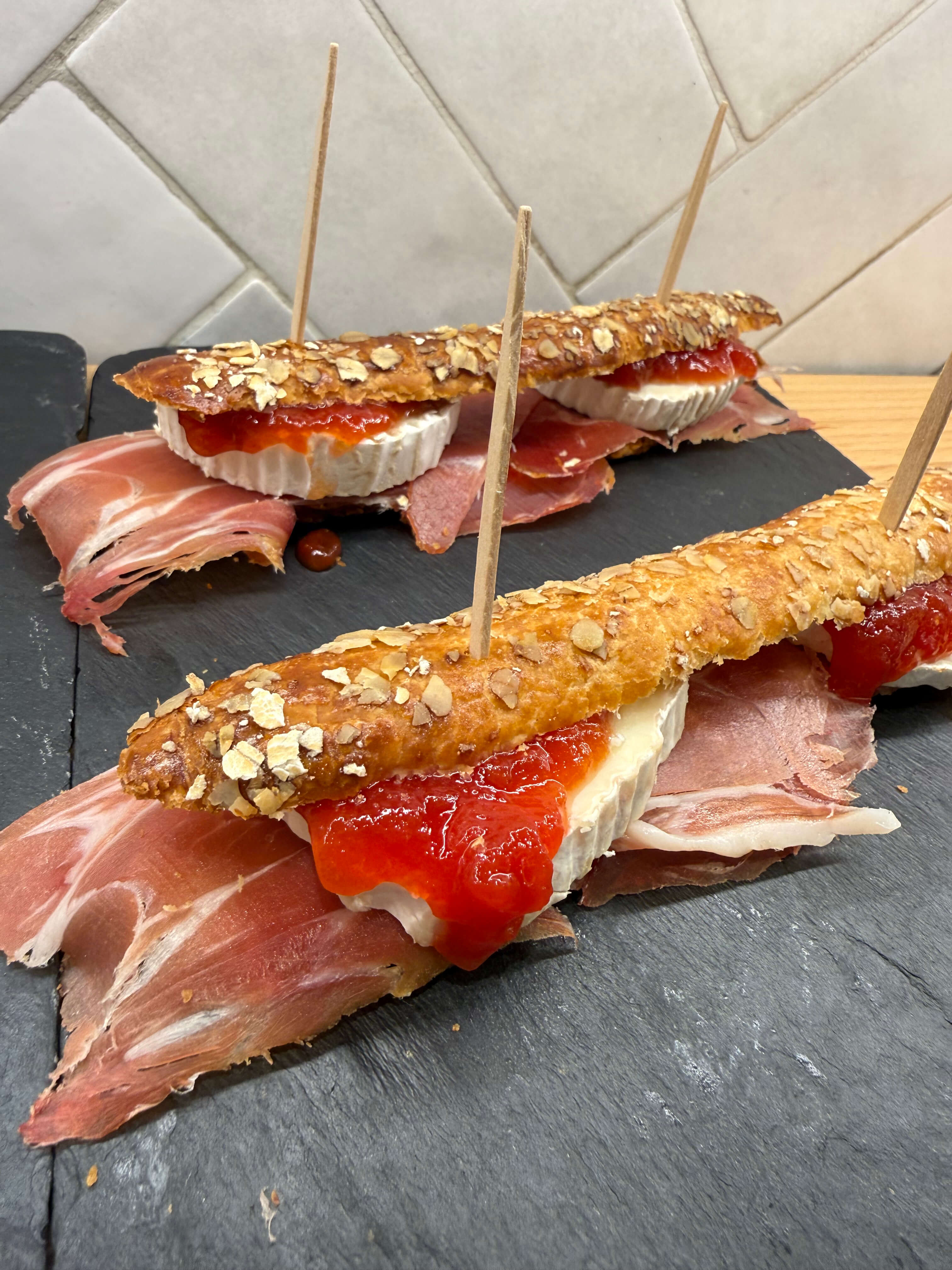 Fartón con jamón serrano, queso de cabra y mermelada de tomate.