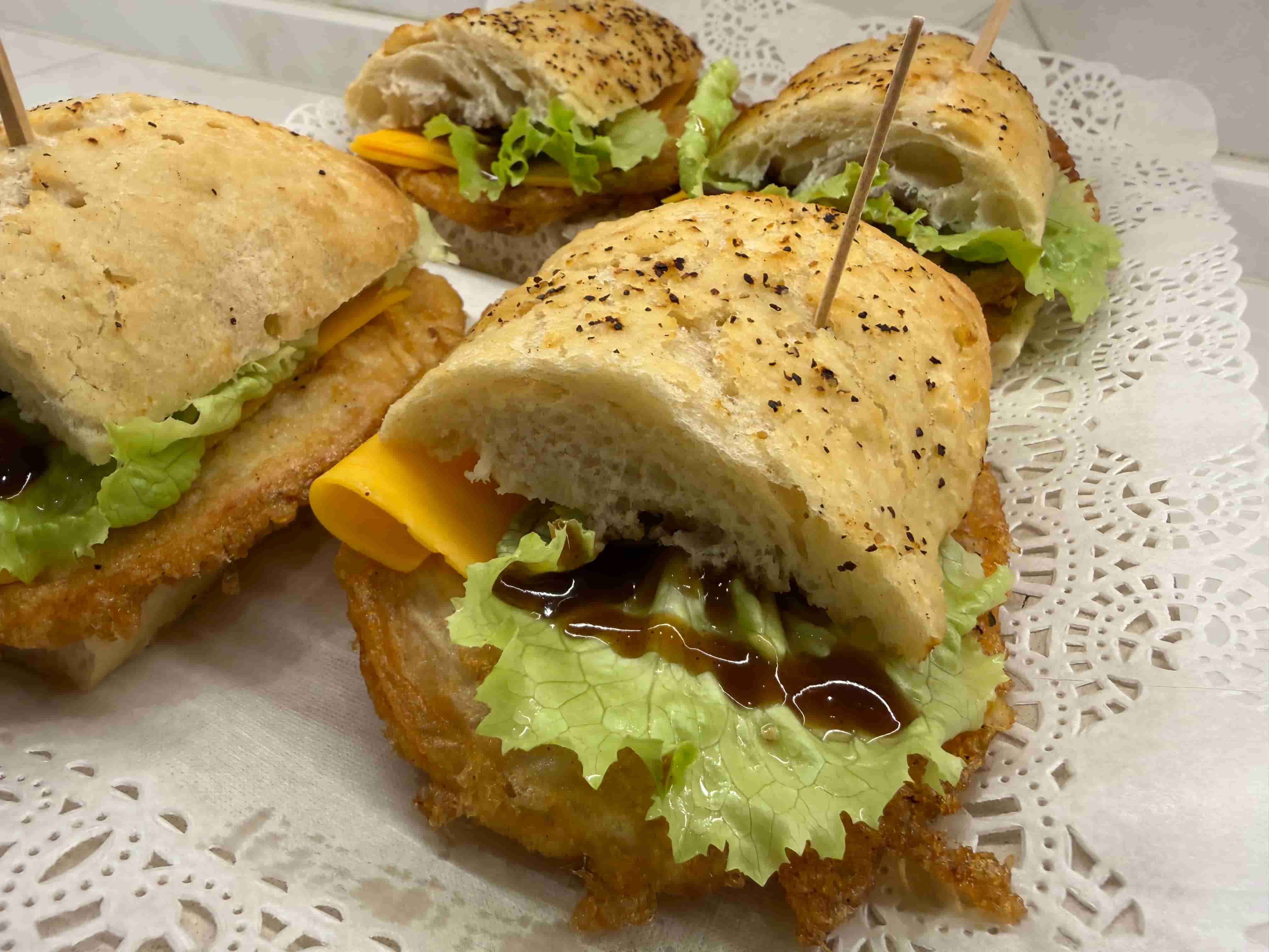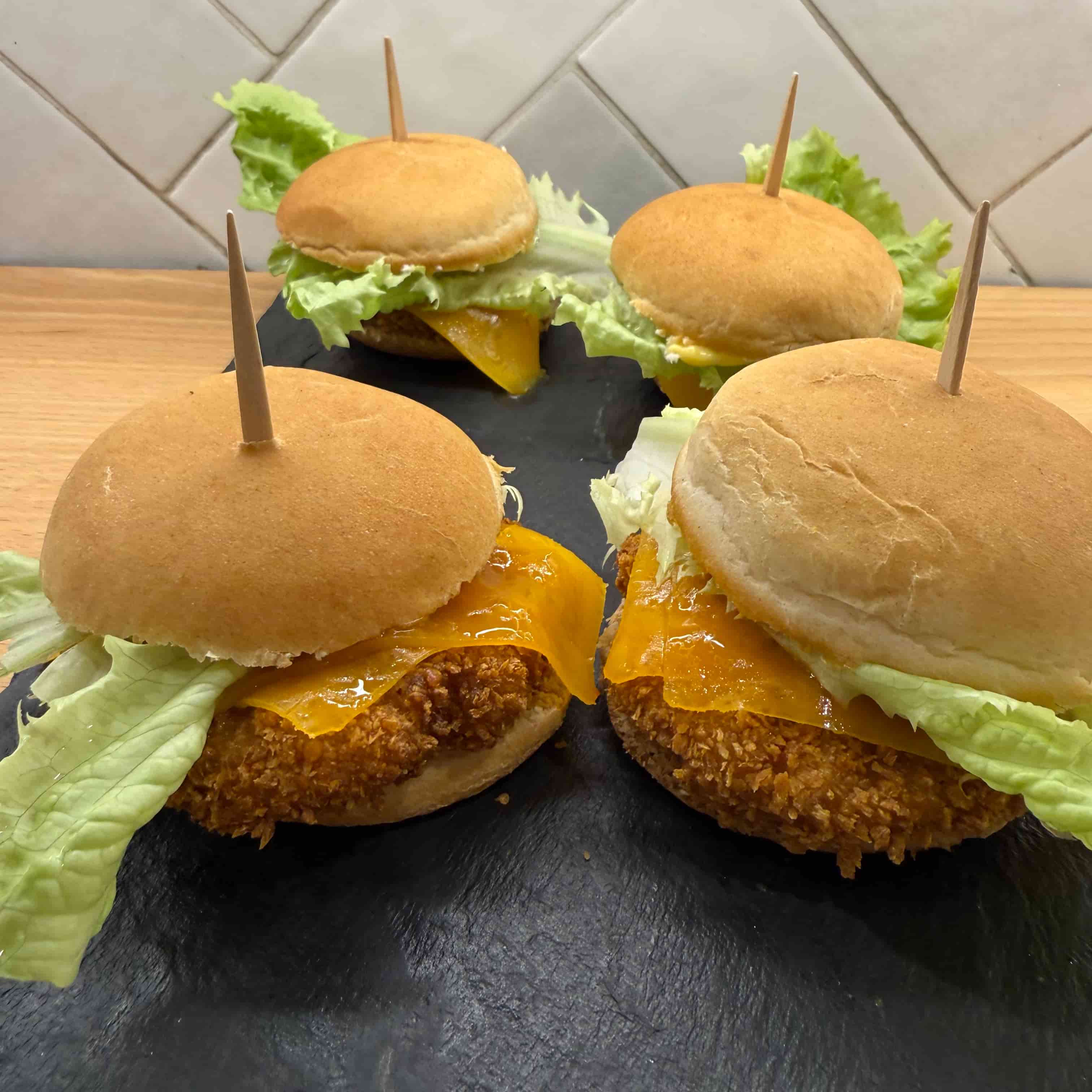 Pan, hamburguesa de pollo, queso cheddar y mahonesa.