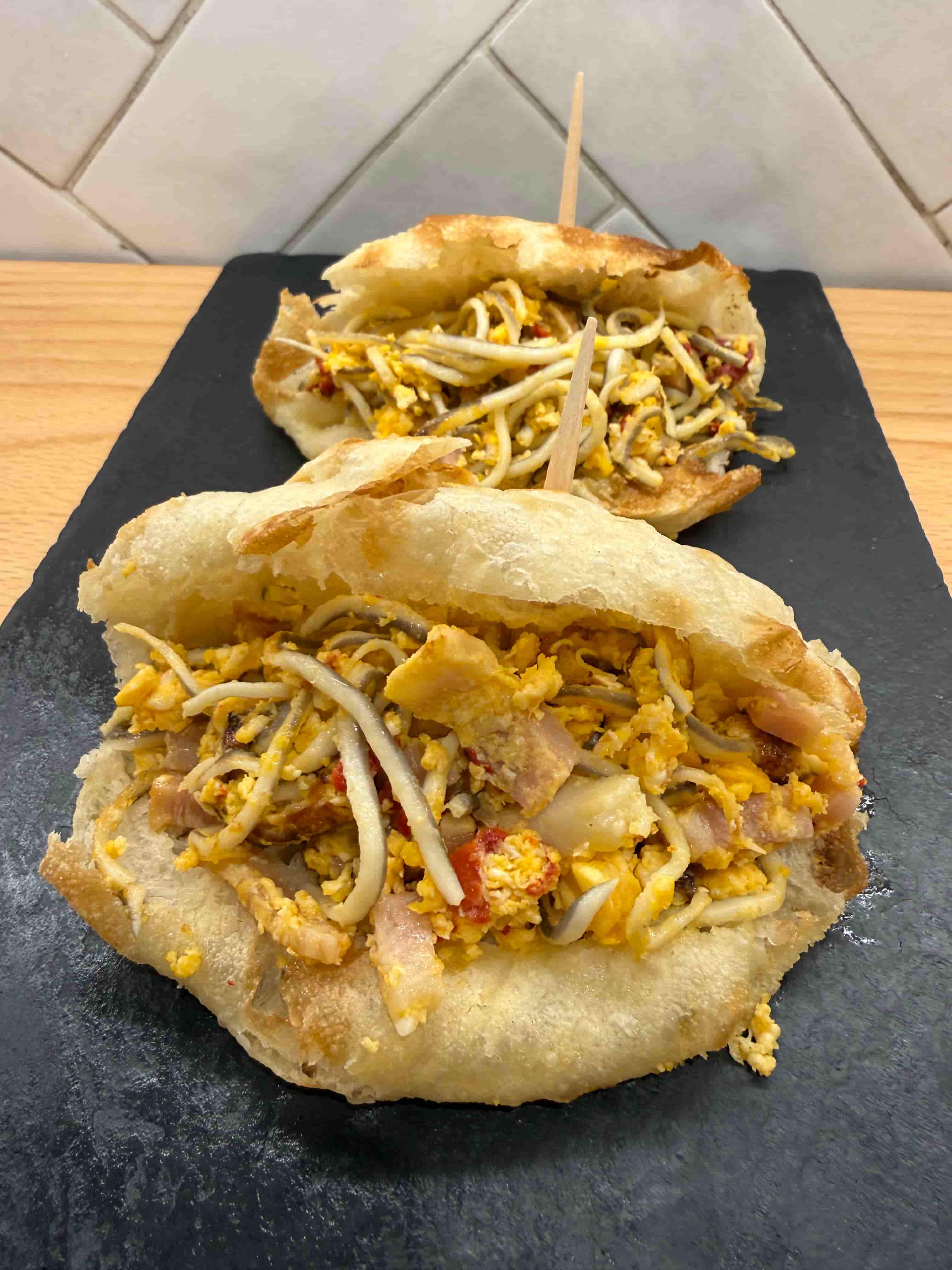 Focaccia, huevo, gulas, jamón serrano, baicon y pimiento.