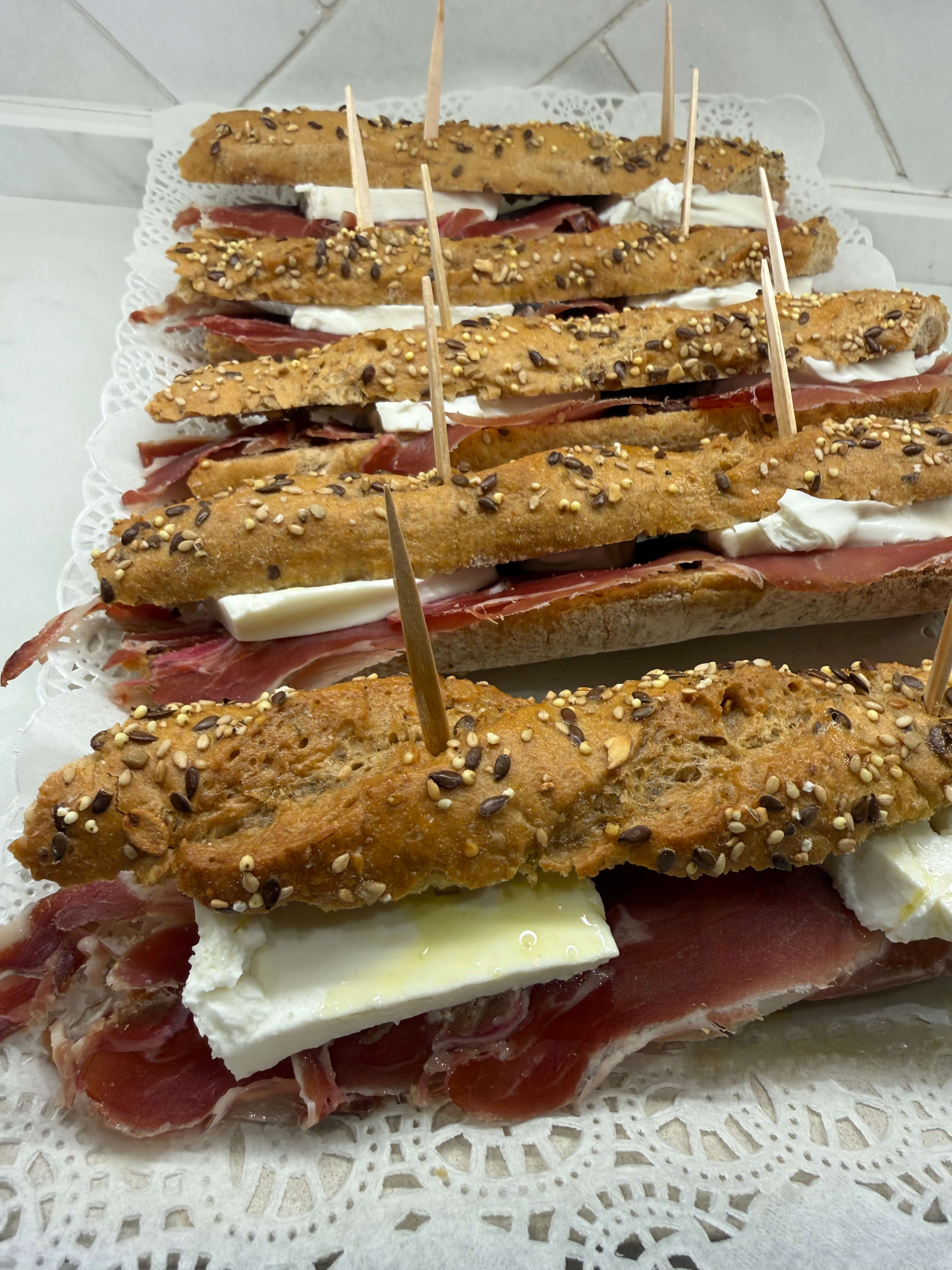 Flauta multicereal con jamón serrano y queso fresco.