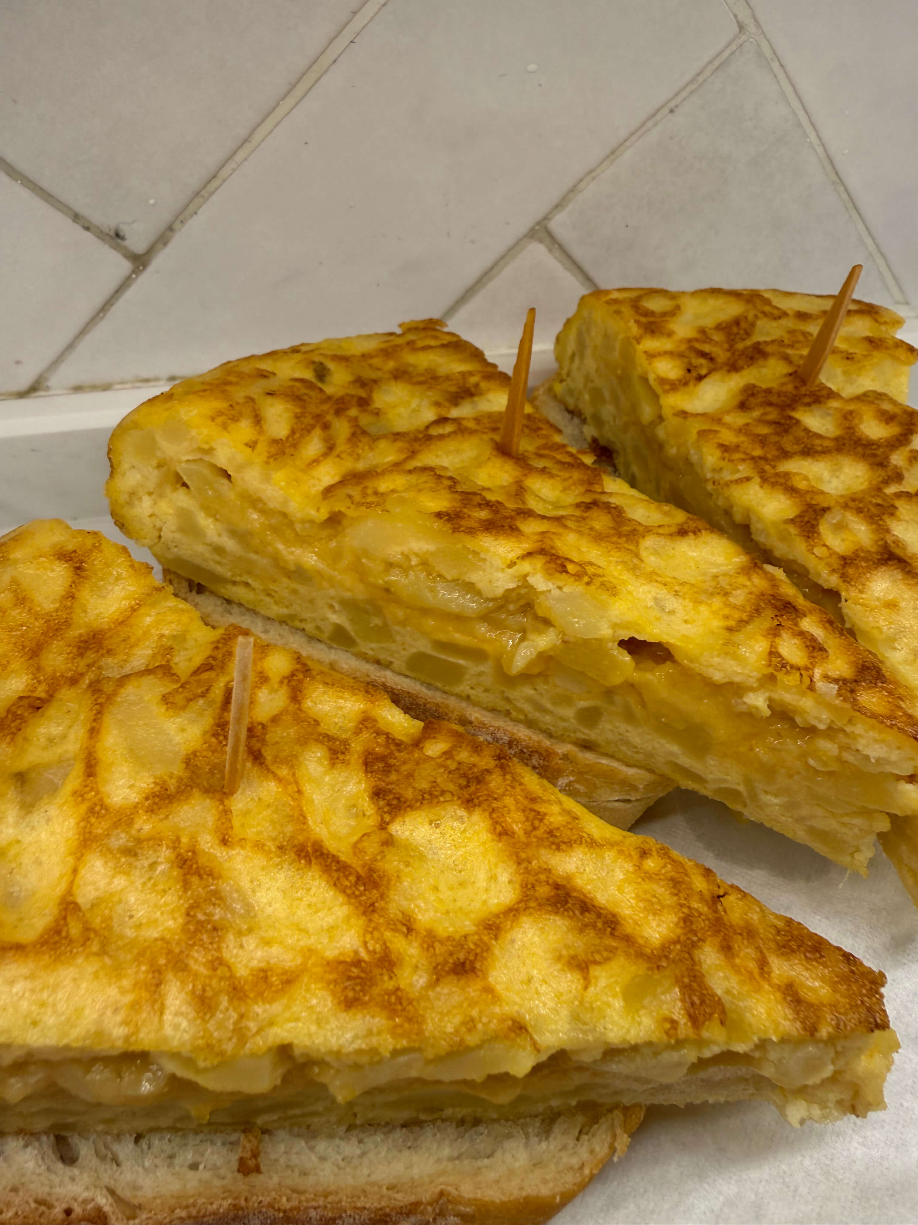Tortilla de patata con cebolla, jamon serrano, lechuga y mahonesa.