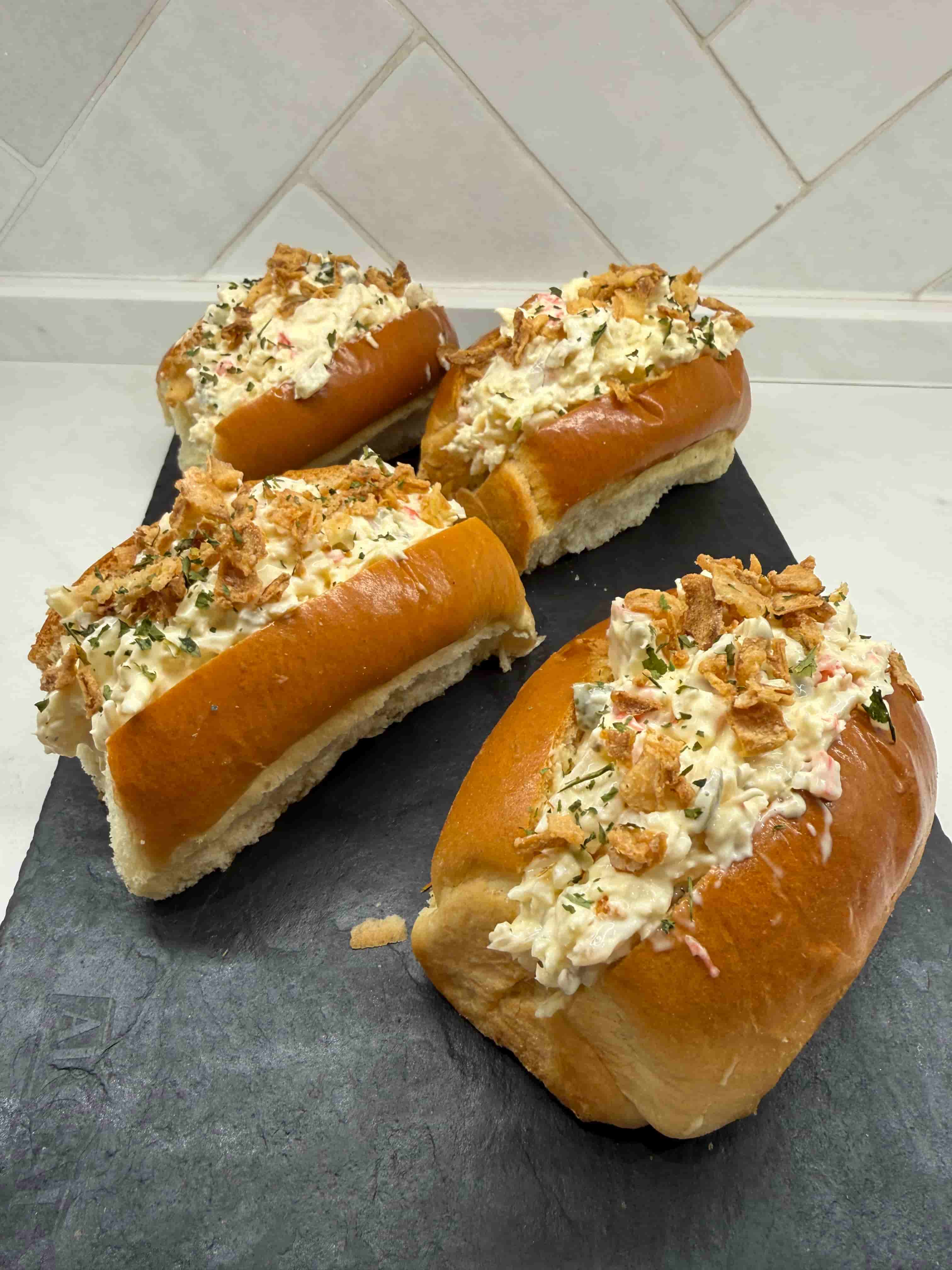 Pan brioche con ensaladilla de merluza (merluza, aceituna, cebolla, palitos de mar y mahonesa).