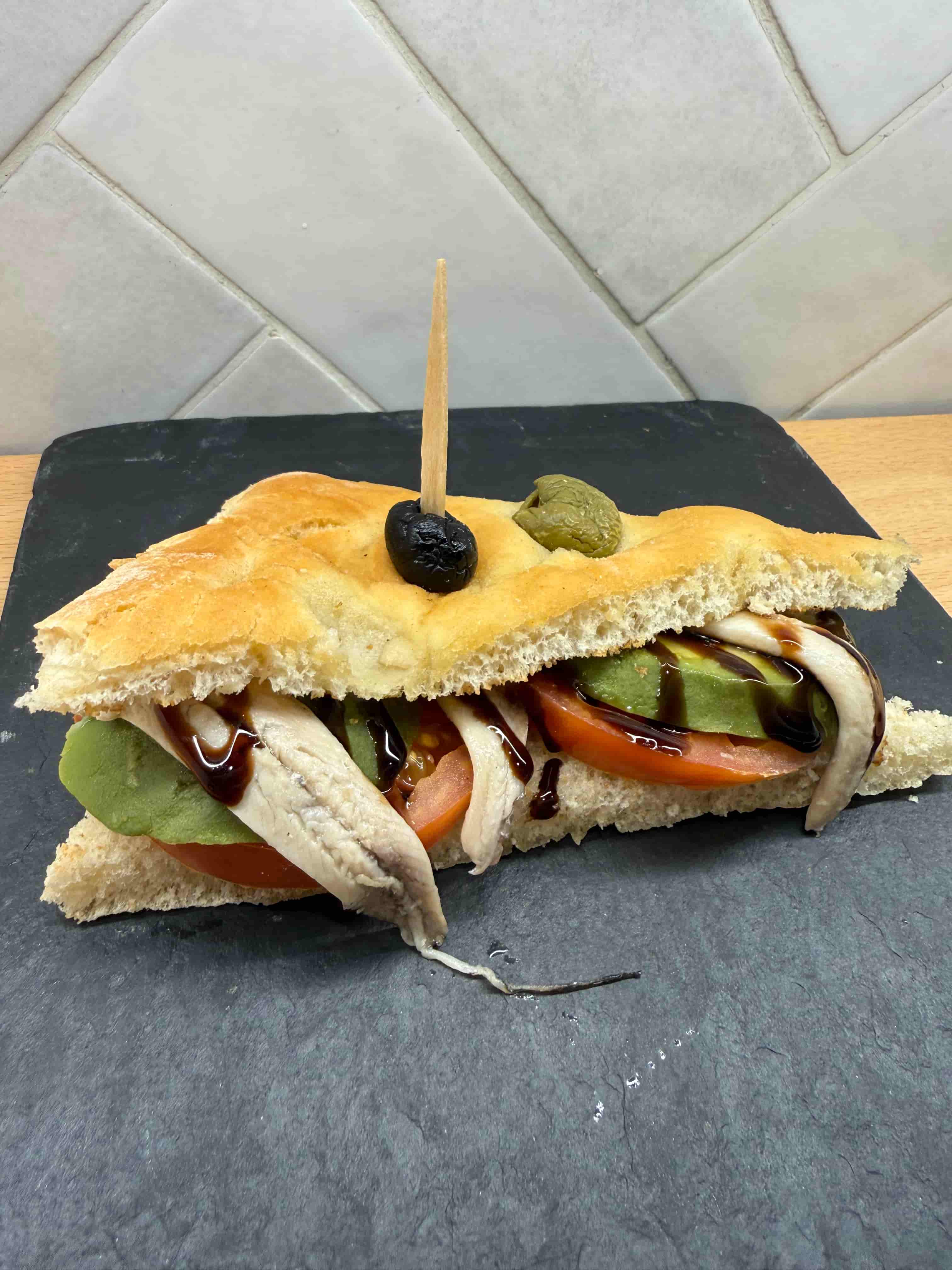 Focaccia, tomate, aguacate y boquerón.