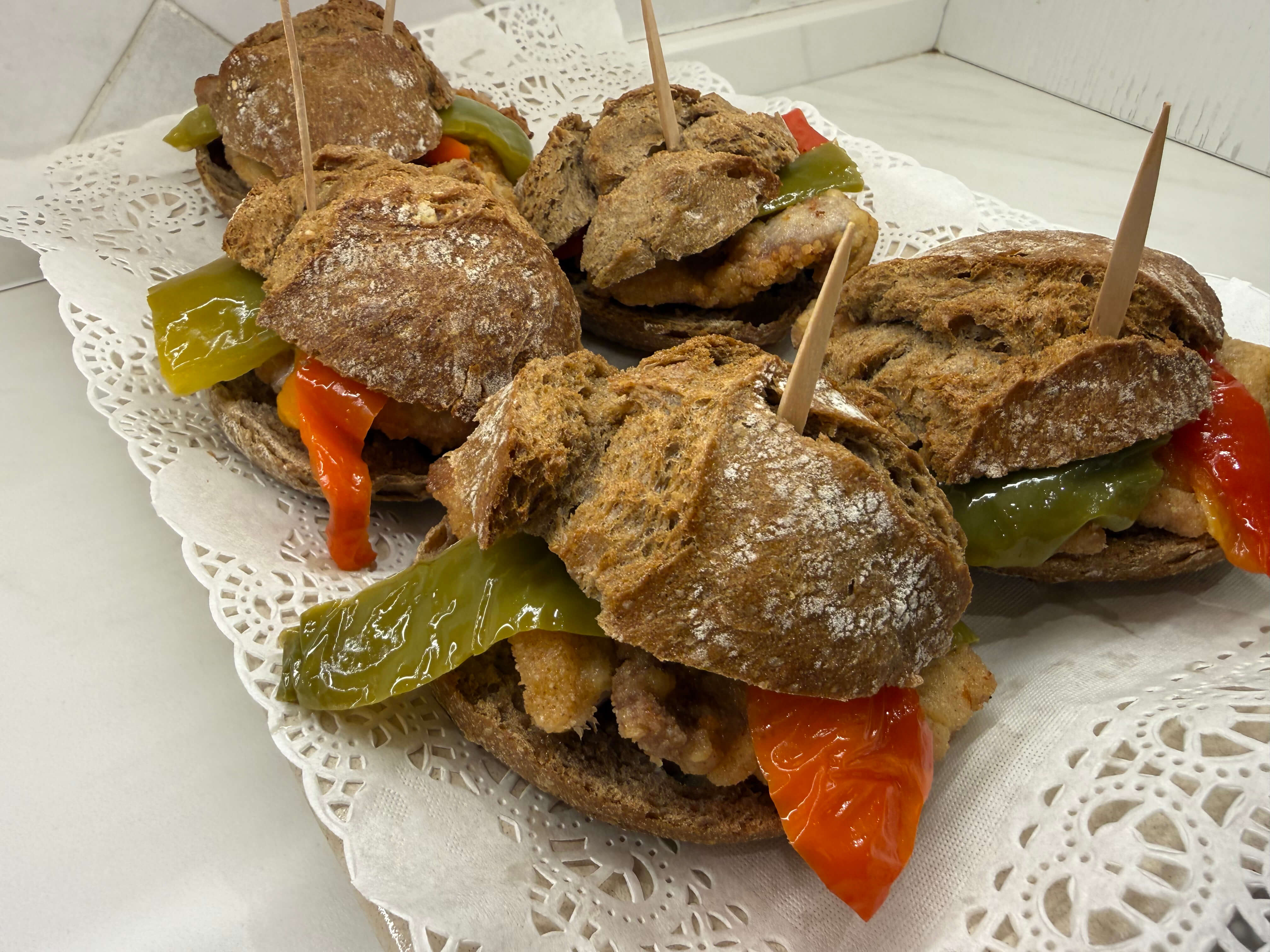 Pan de cebada con carne empanada y pimientos.