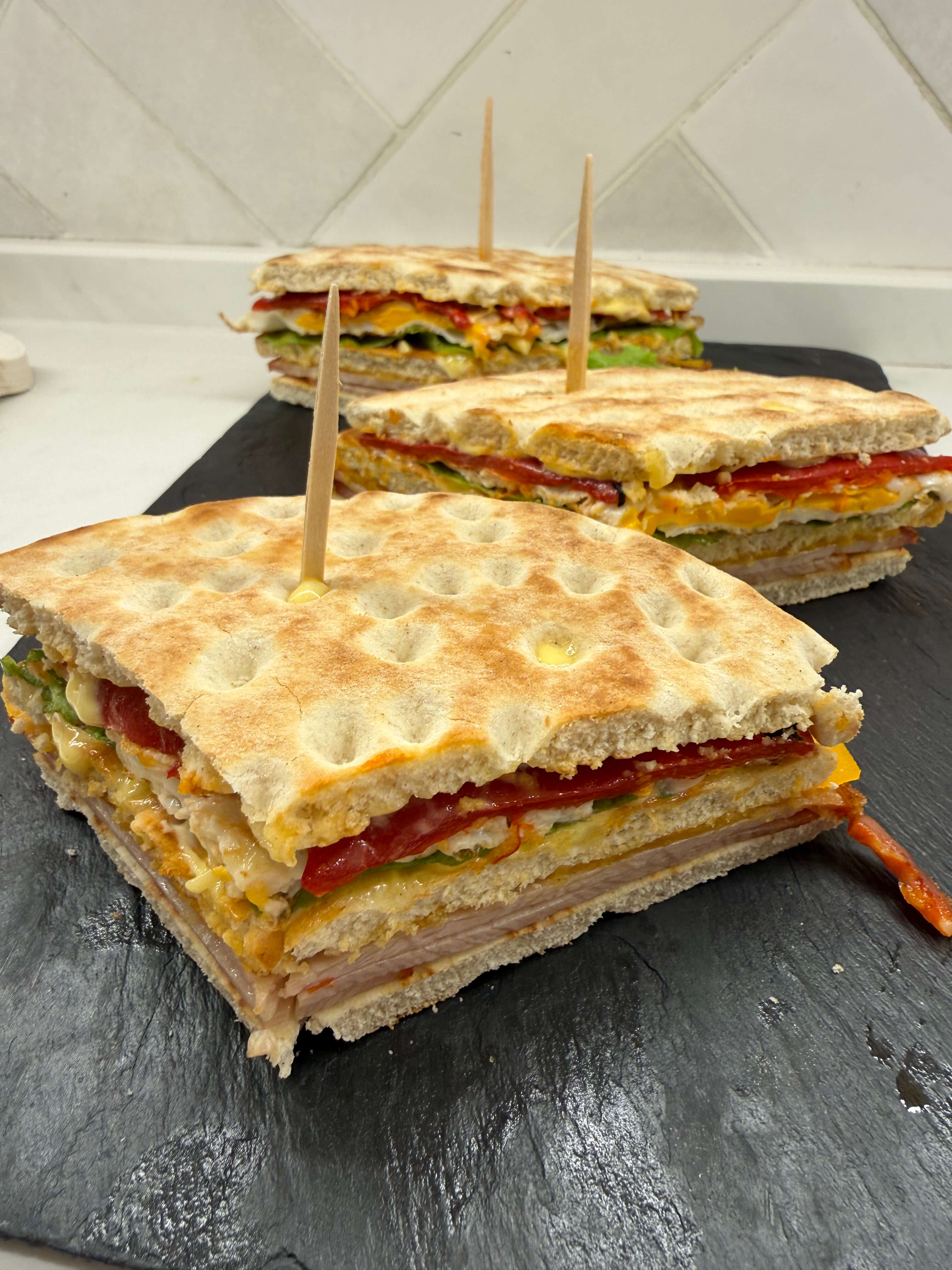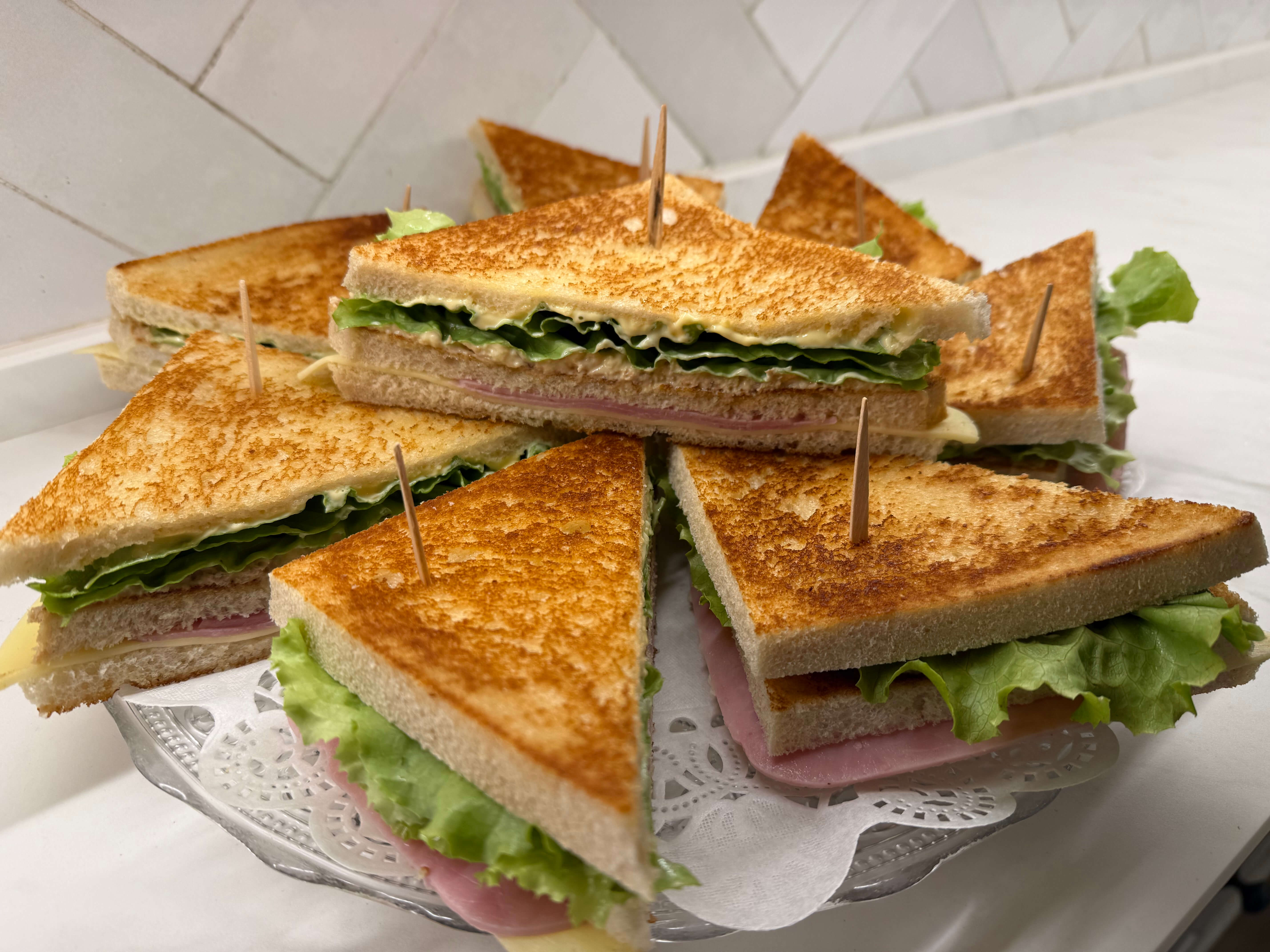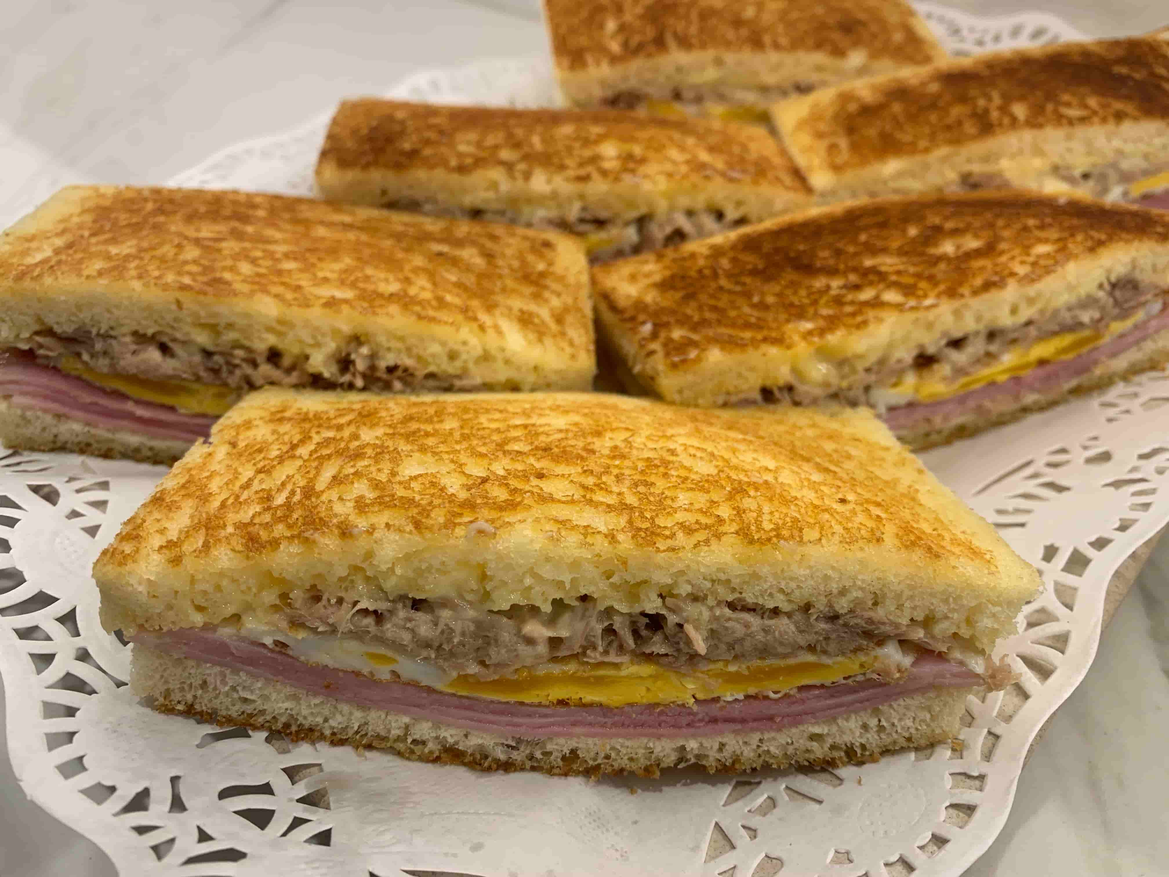 Sándwich tostado, York, huevo plancha, atún y mayonesa.