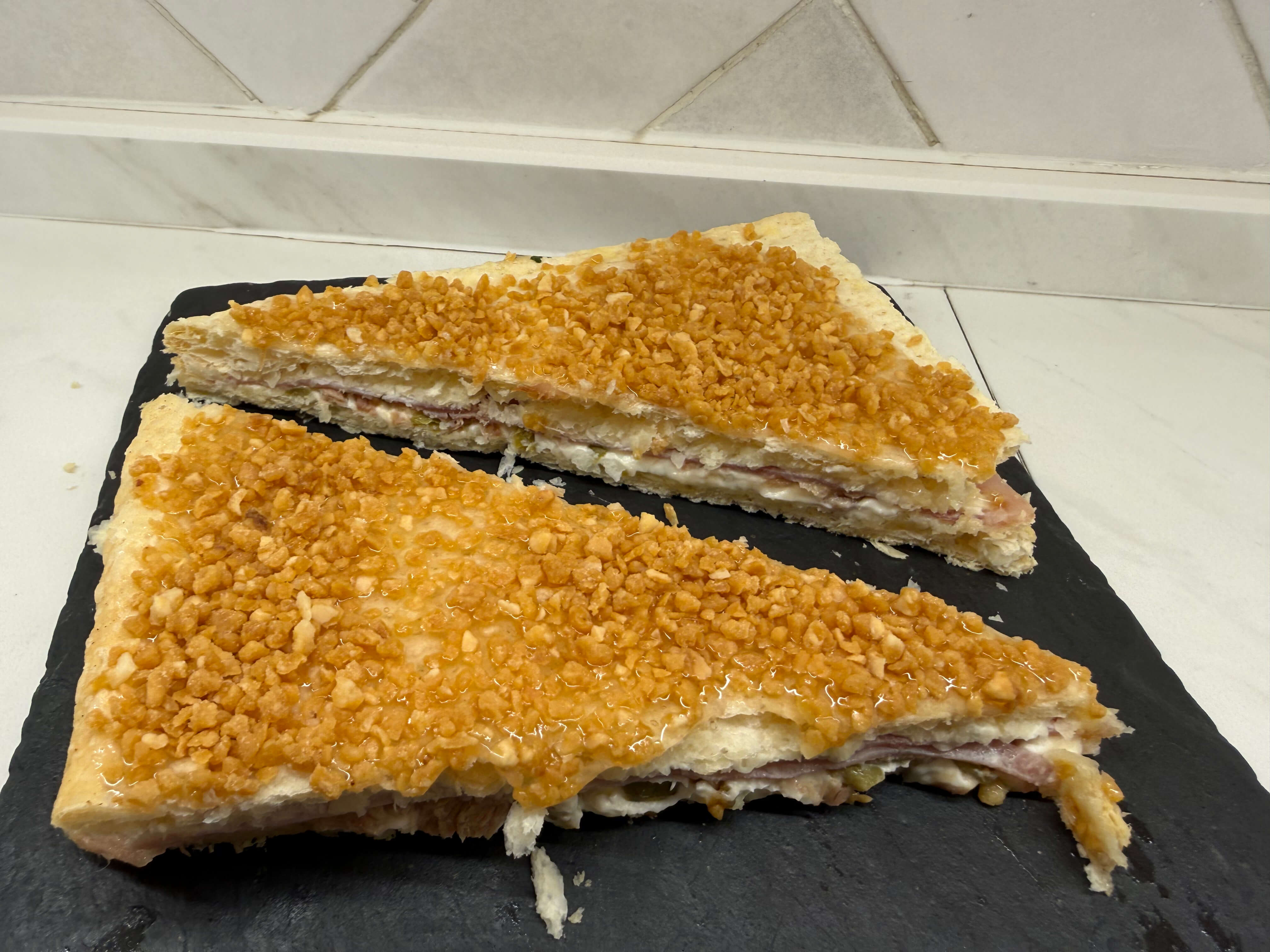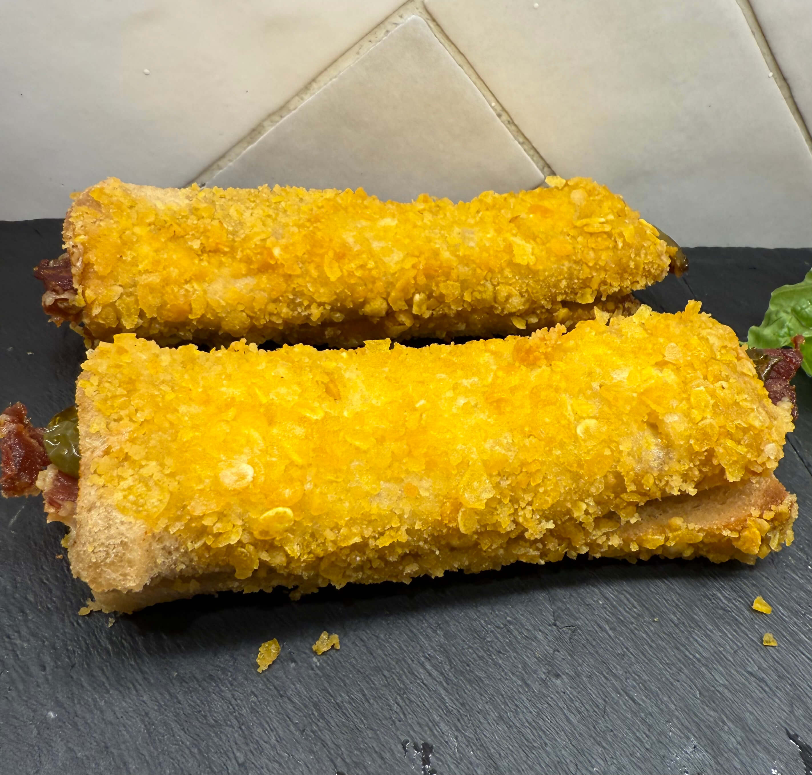 Pan de sandwich con rebozado crujiente, jamón serrano y pimiento.