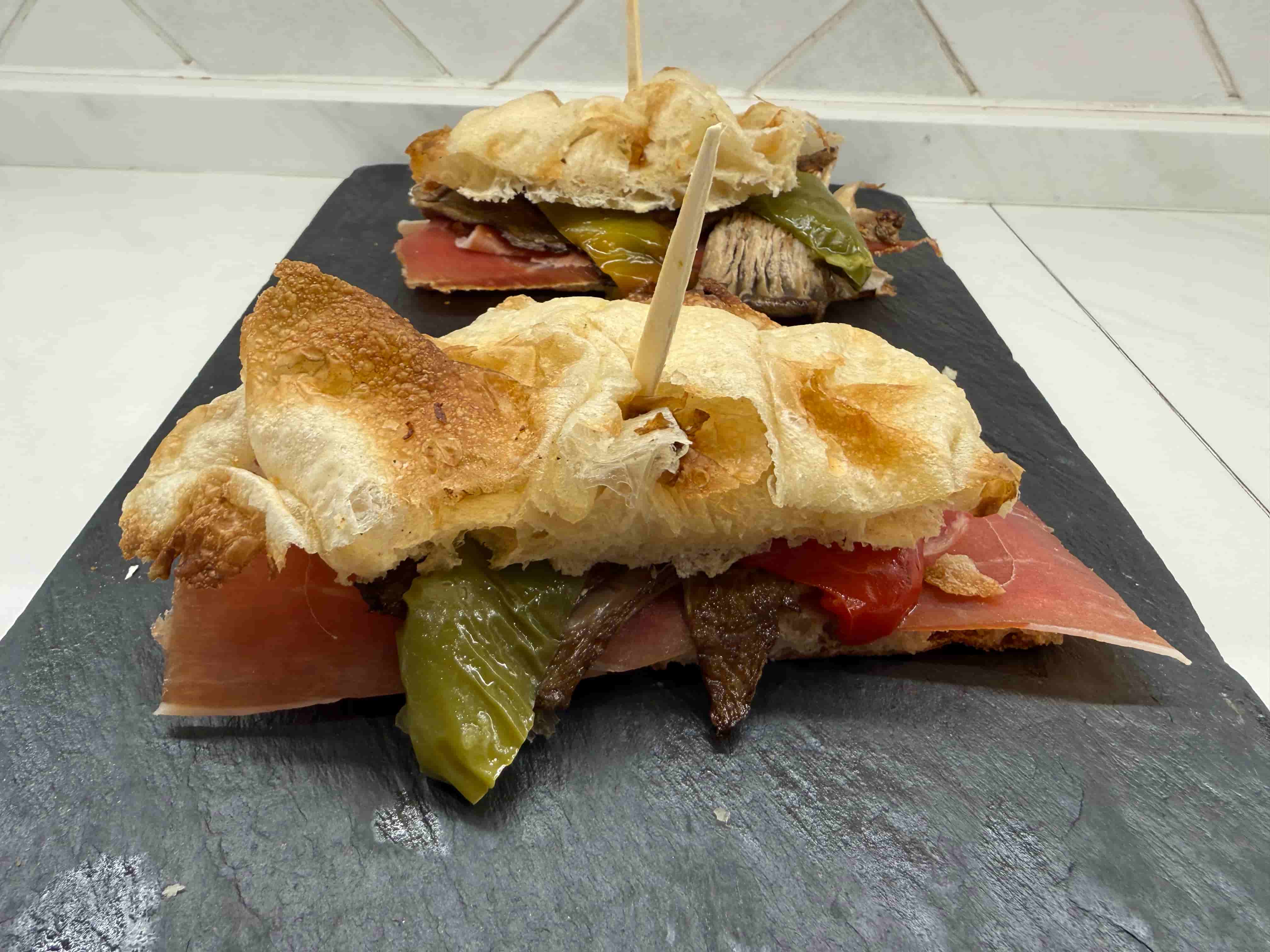 Focaccia con jamon serrano setas y pimientos.