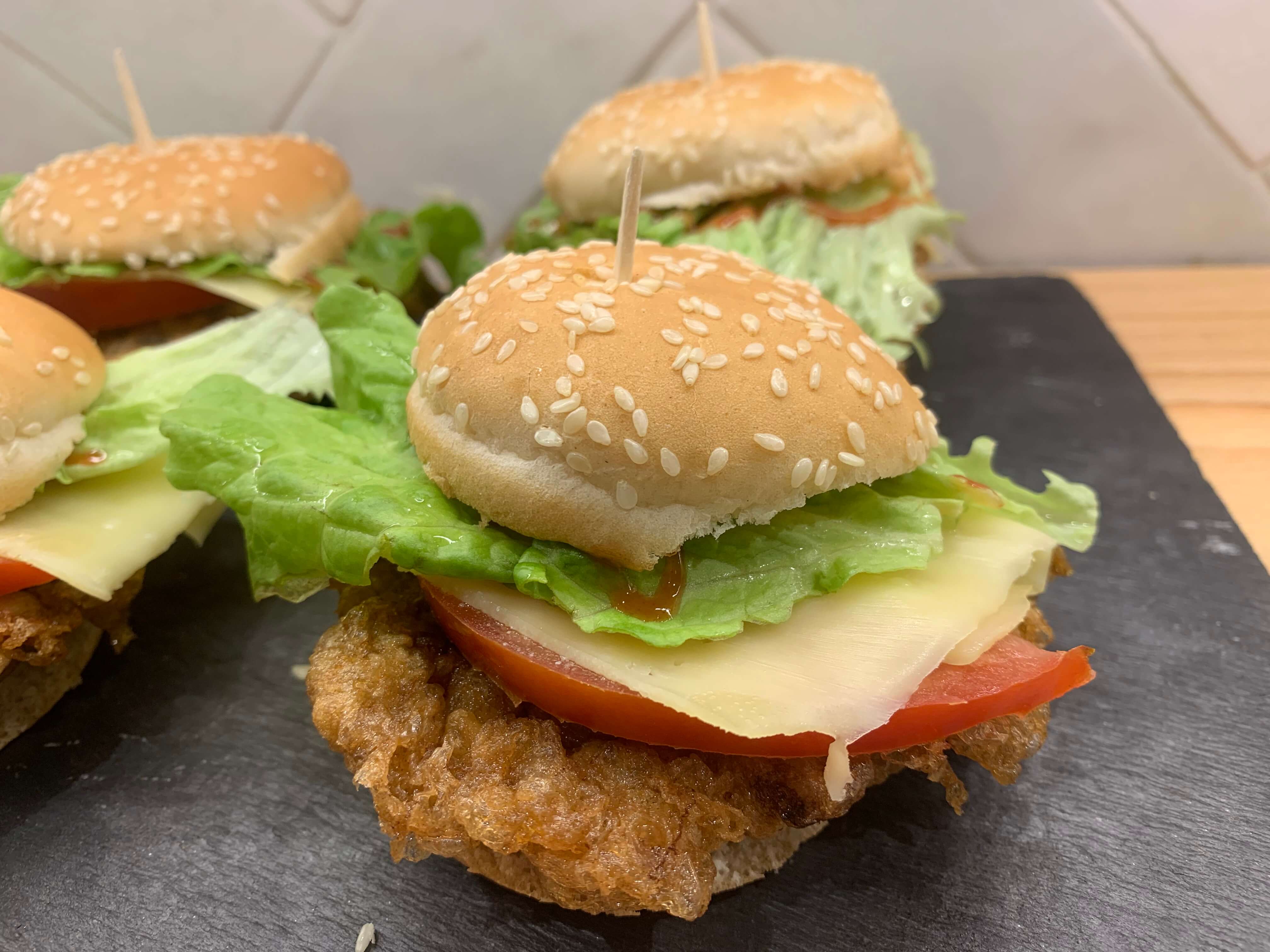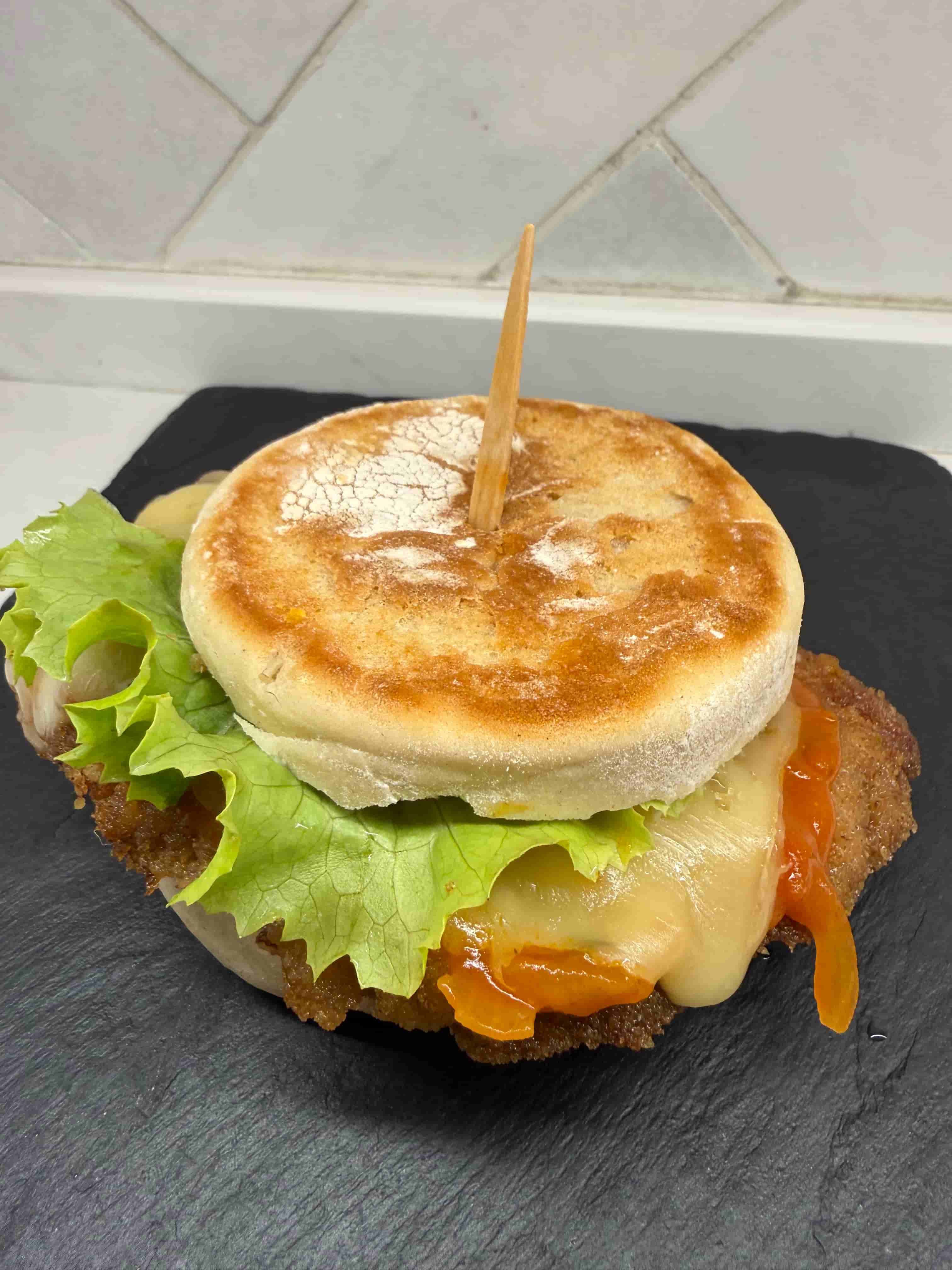 Pan, hamburguesa de pollo, queso cheddar y mahonesa.