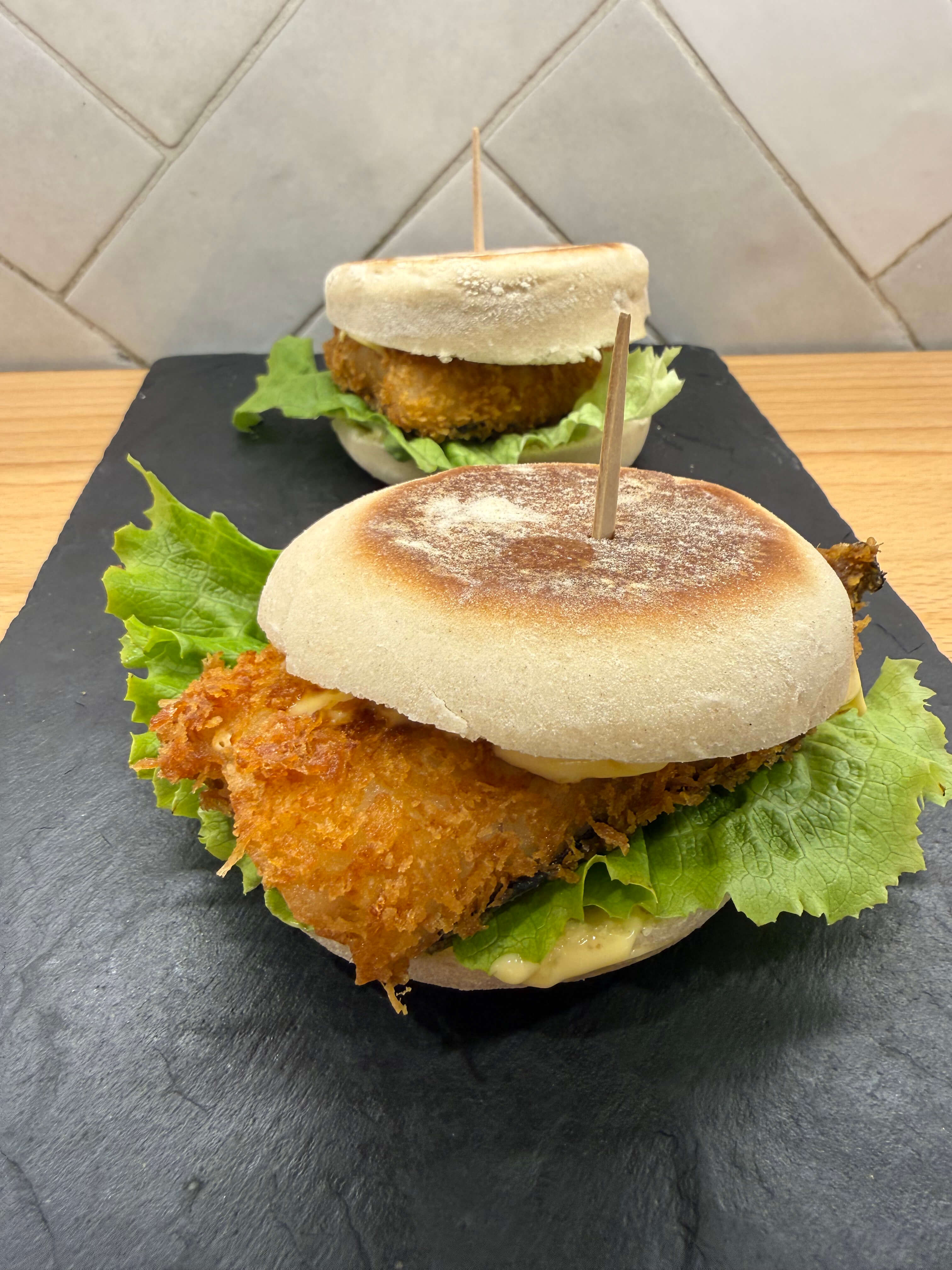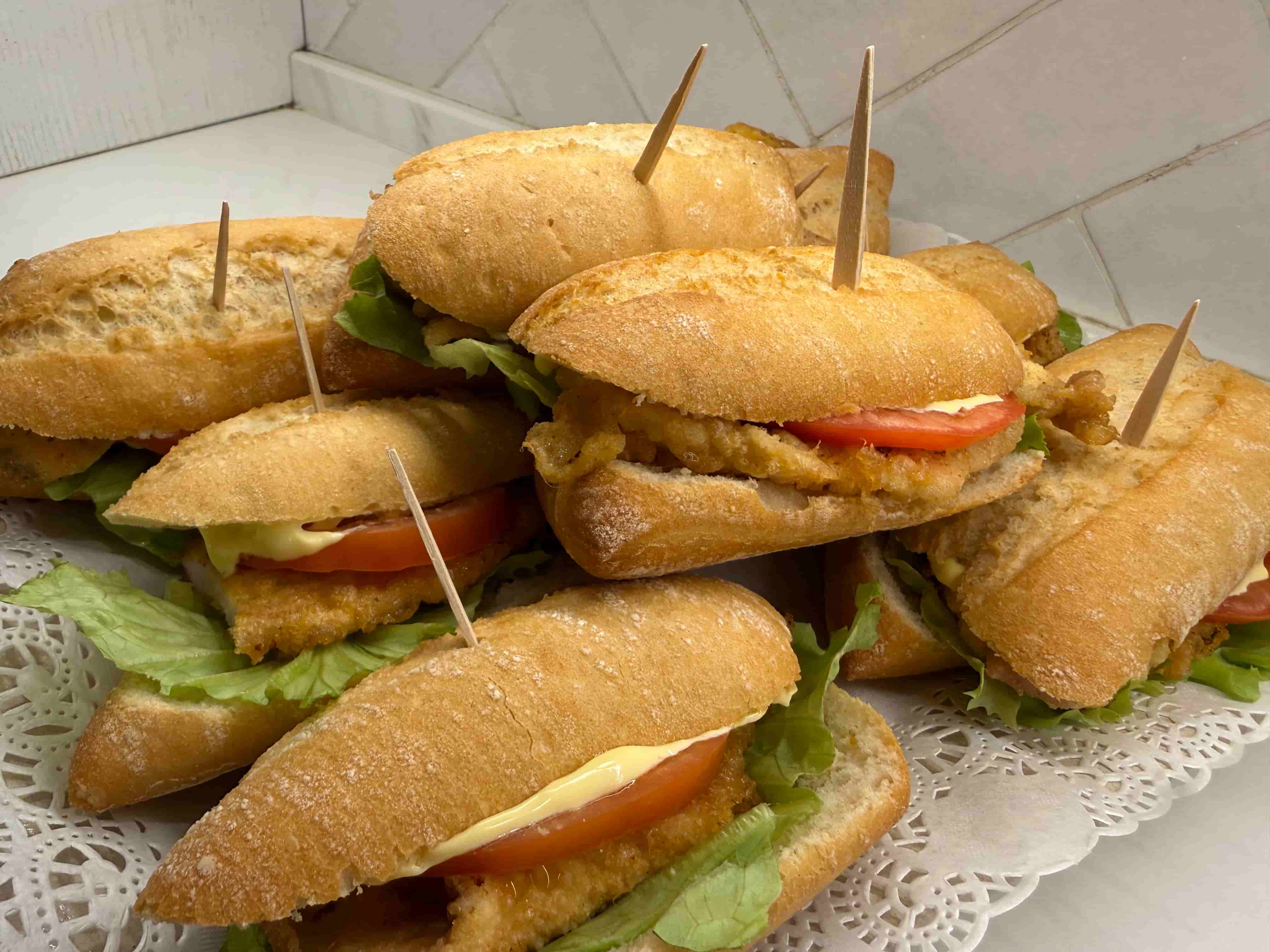 Montadito de pollo rebozado, lechuga, tomate y mayonesa.