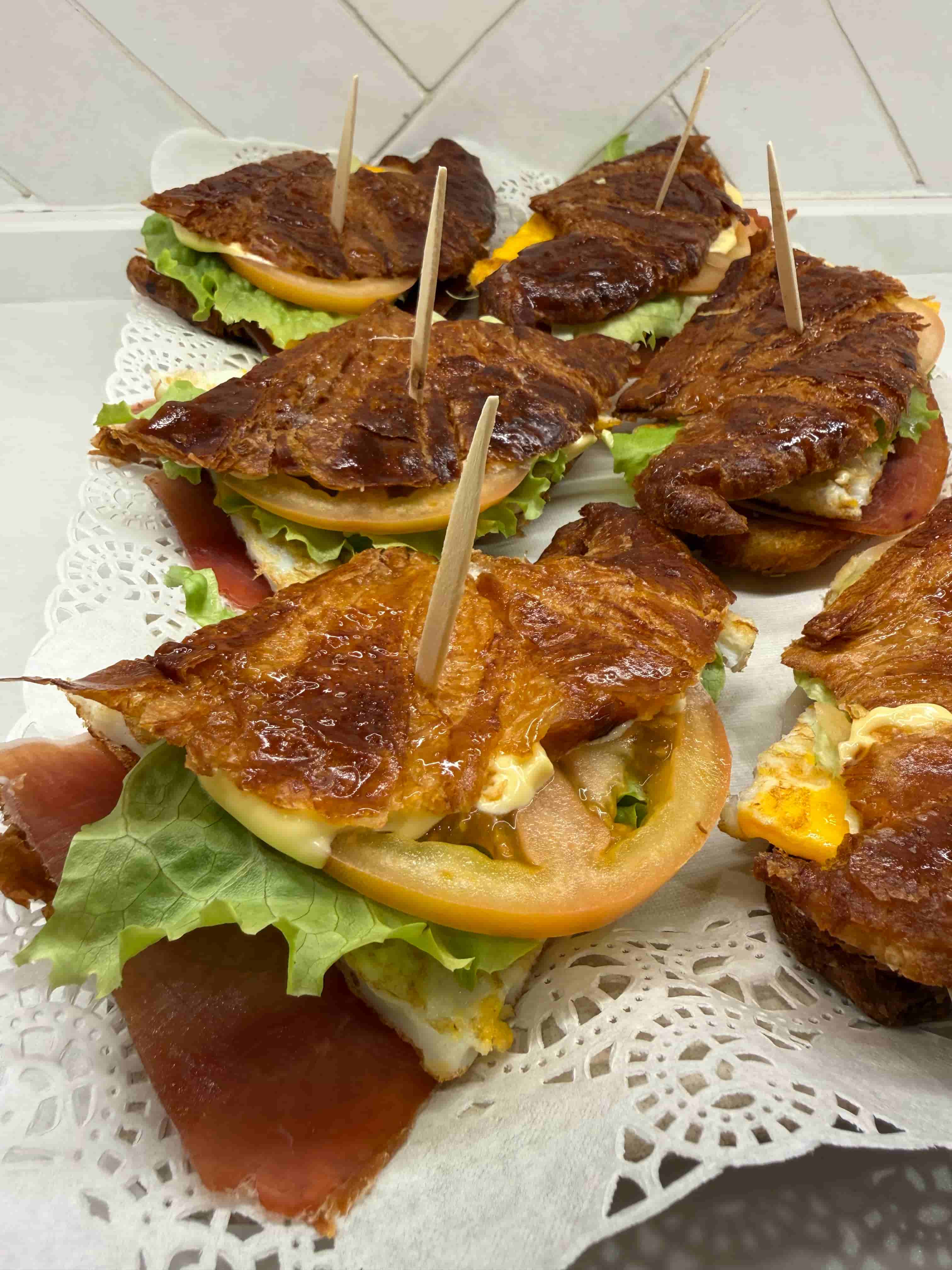 Cruasan, jamon serrano, huevo, lechuga, tomate y mahonesa.