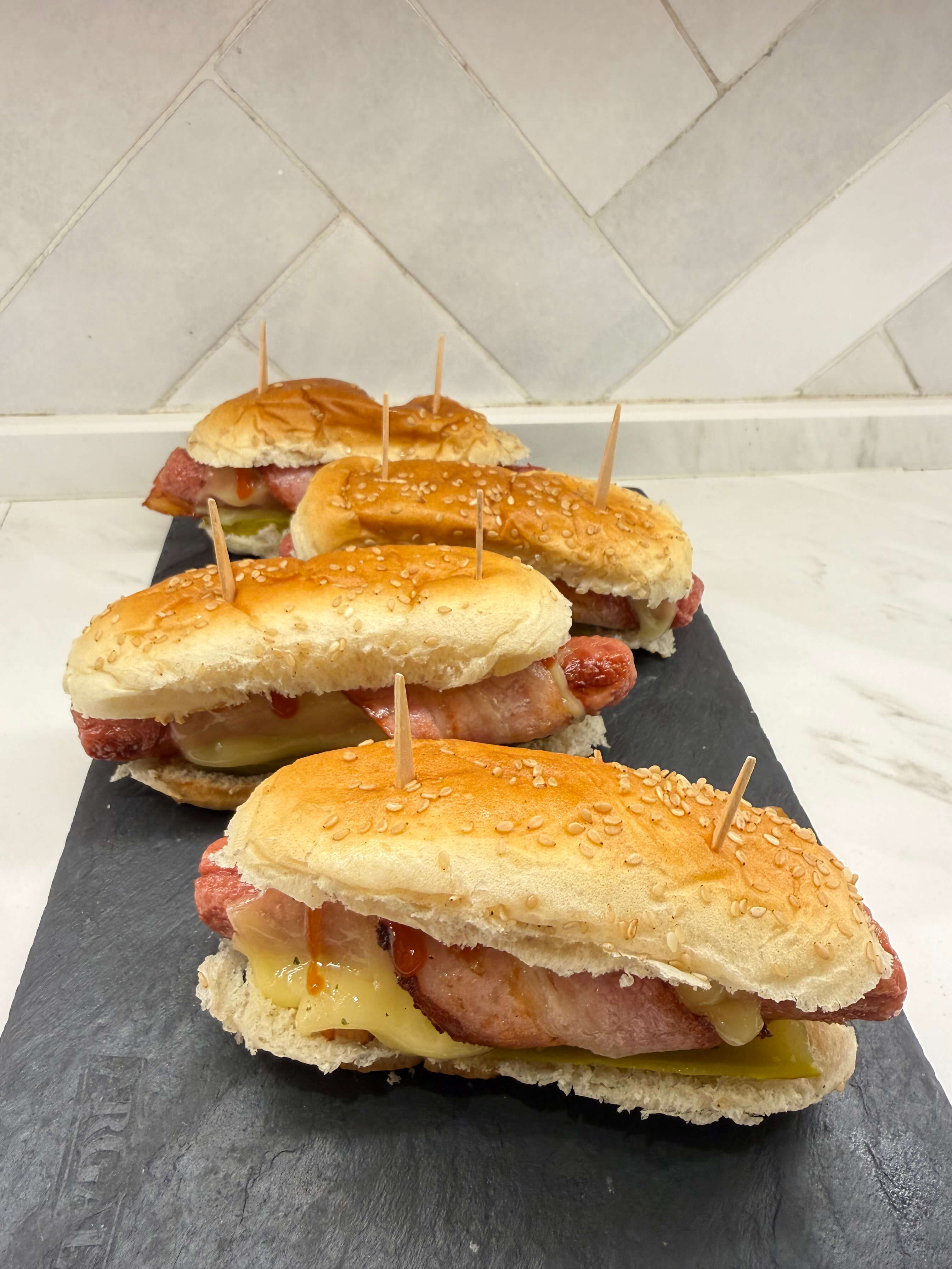 Pan, salchicha, queso, baicon, pepinillo y Kepchup.
