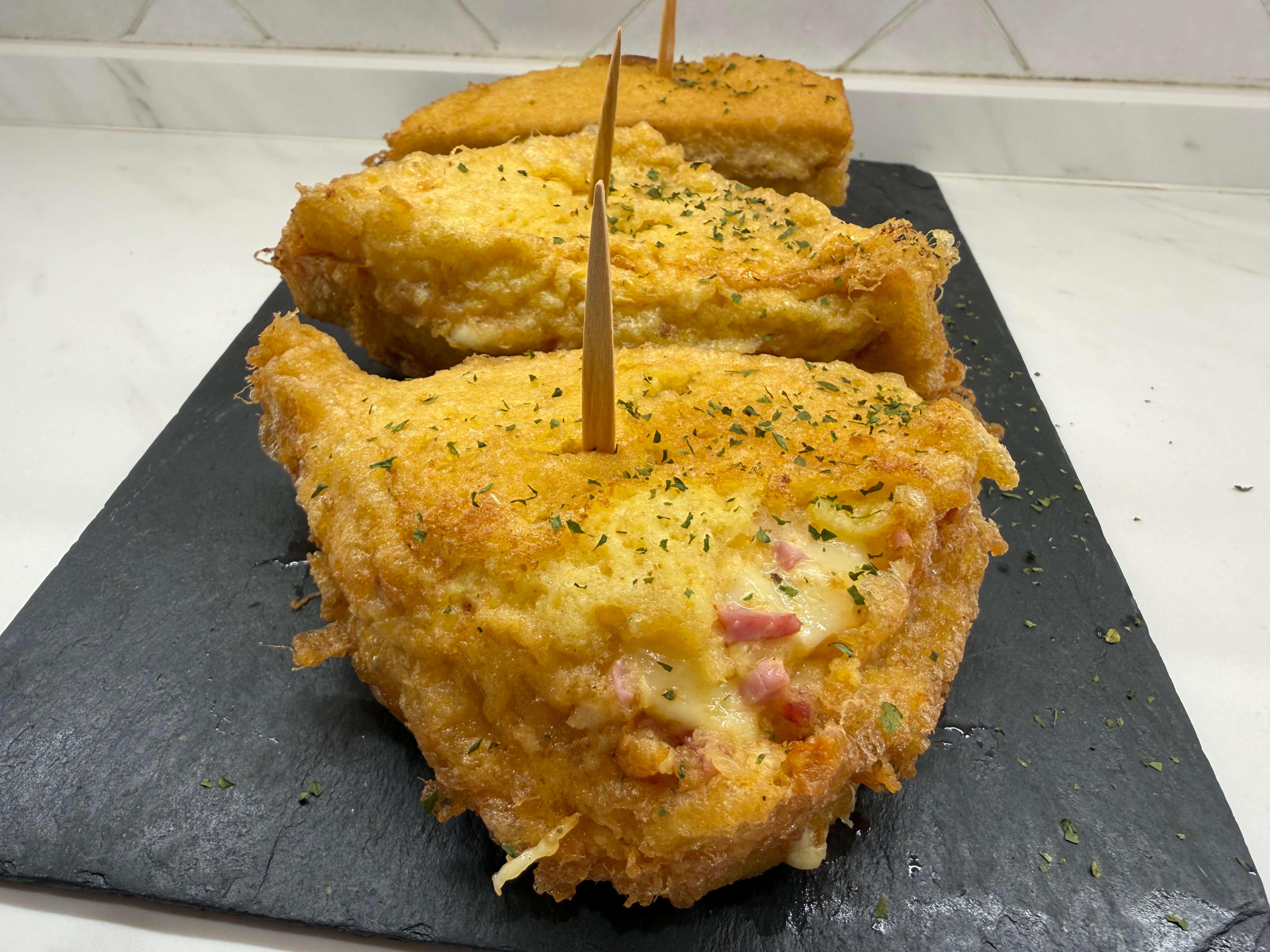 Montadito de lomo rebozado y queso.