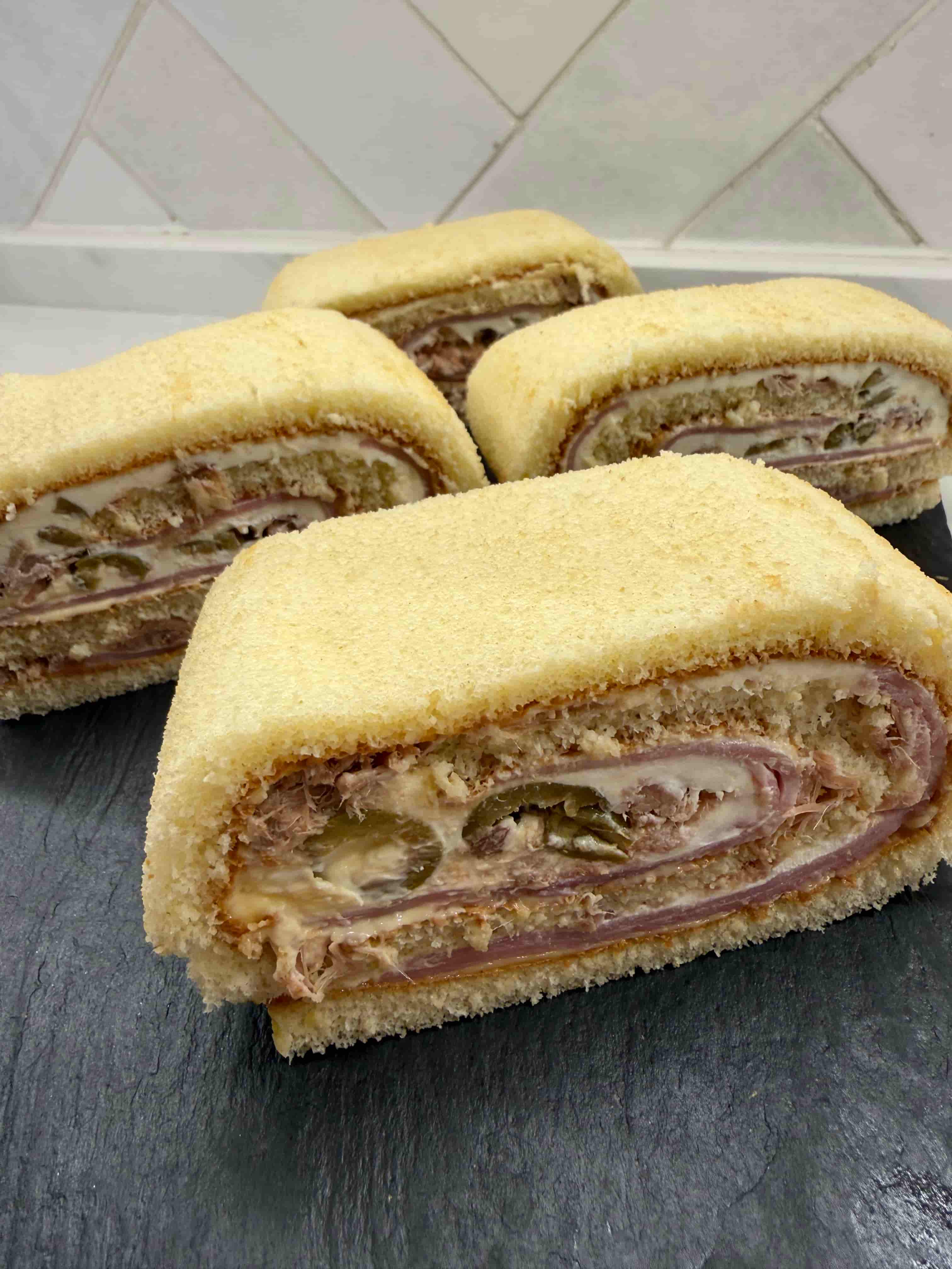 Plancha de Pionono, queso filadelfia, jamon york, mahonesa, atún y aceituna.