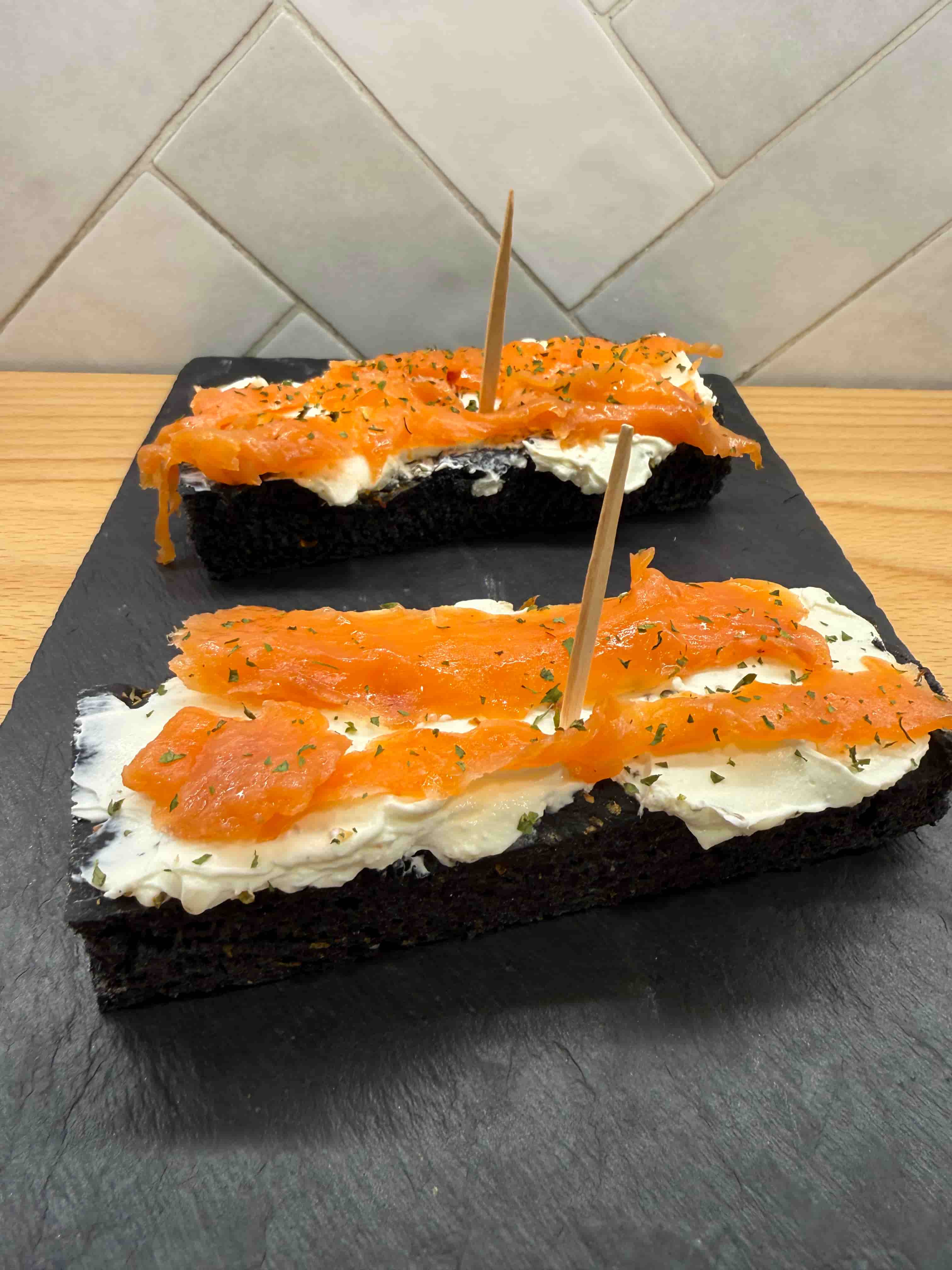 Focaccia de carbón vegetal, queso philadelphia y salmón.
