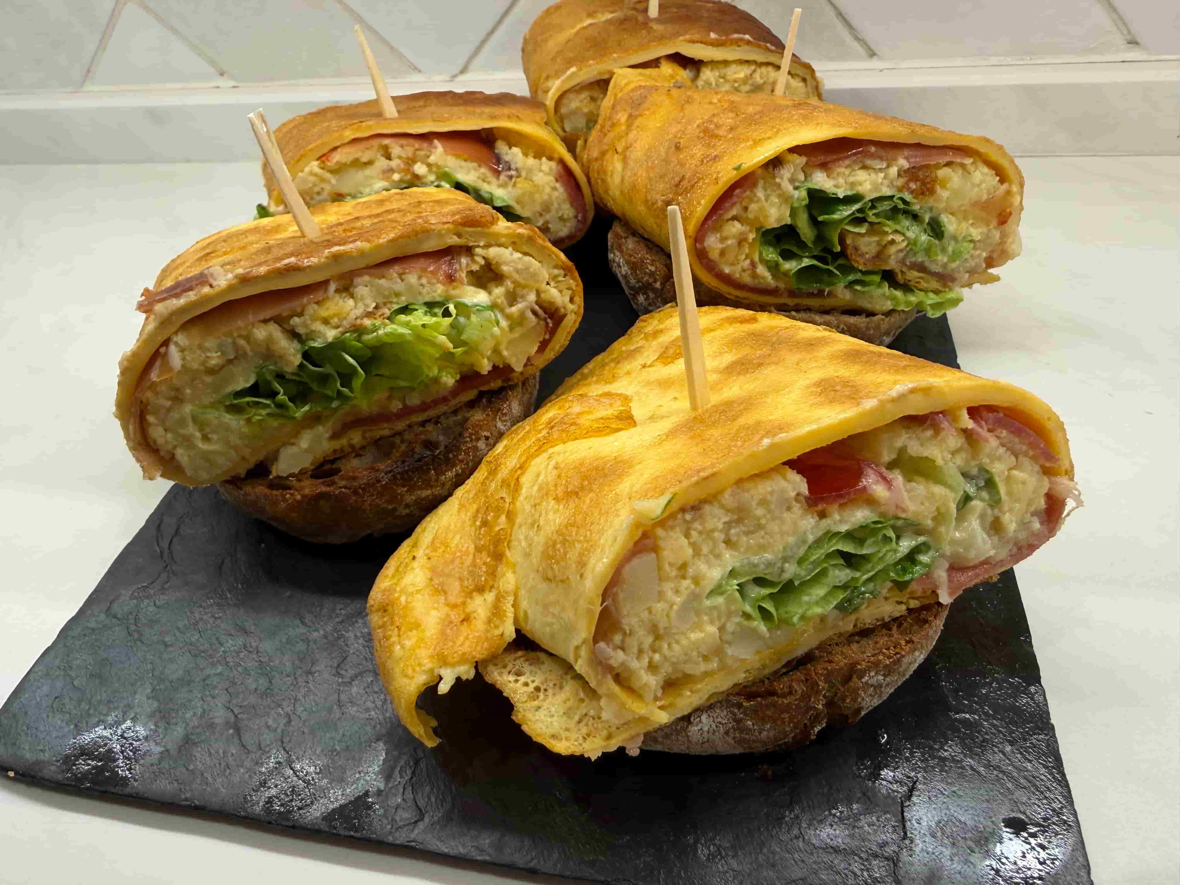 Tortilla de patata con cebolla, jamon serrano, lechuga y mahonesa.